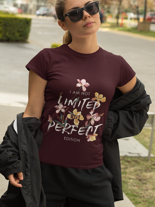 Women's Maroon T-Shirt – Elegant Floral Print 'I Am Not Limited, But Perfect Edition'