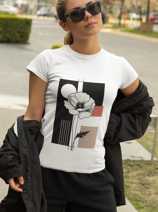 Minimalist Floral Women's T-Shirt – Classic White with Monochrome Design