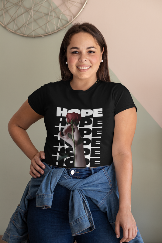 Women's Black Crew T-Shirt – Elegant ‘Hope’ Print with Rose Accent