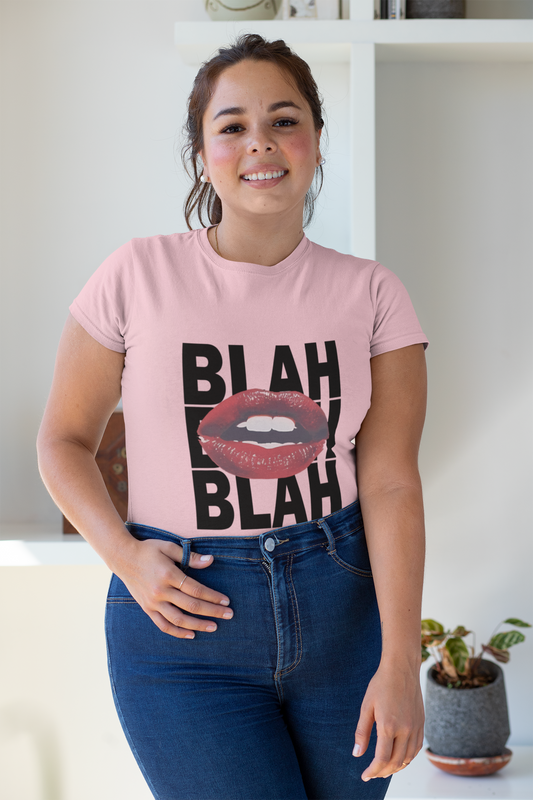 Baby Pink Women's Crew T-Shirt – Funky Blah Blah Text with Red Lips Graphic
