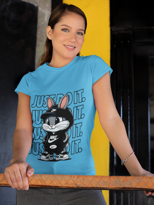 Adorable Sky Blue Tee – ‘Just Do It’ with Playful Bunny Design