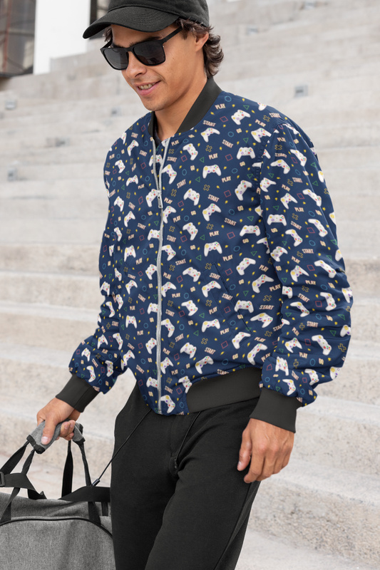 Level Up: Gamer's Blue Game Controller Print Bomber Jacket