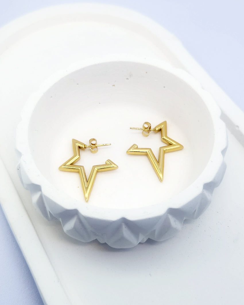 Adorn your ears with a touch of stardust. These eye-catching star earrings feature a luxurious 18K gold plating over durable, hypoallergenic stainless steel. Their anti-tarnish properties ensure a lasting gleam, making them the perfect accessory for expressing your inner sparkle with confidence and style.