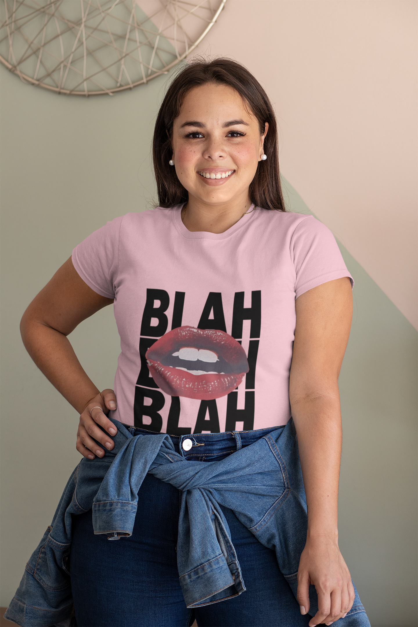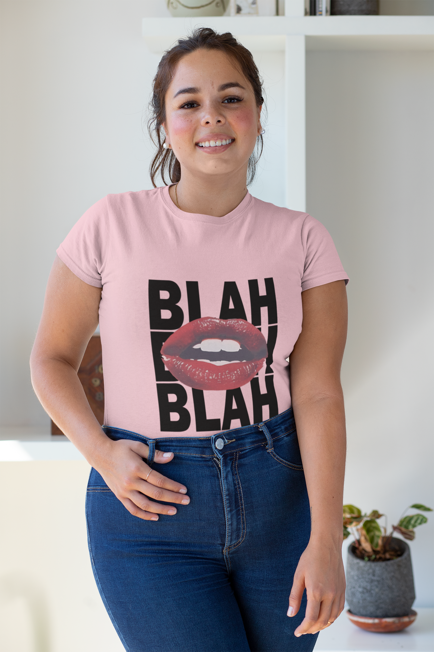 Unleash your funky style with our Baby Pink Women's Crew T-Shirt! Featuring a playful "Blah Blah" text and bold red lips graphic, this tee is bound to turn heads. Made with soft, breathable fabric, it's as comfortable as it is cool. Go ahead, make a statement (without saying a word). (Just kidding, you can still talk).