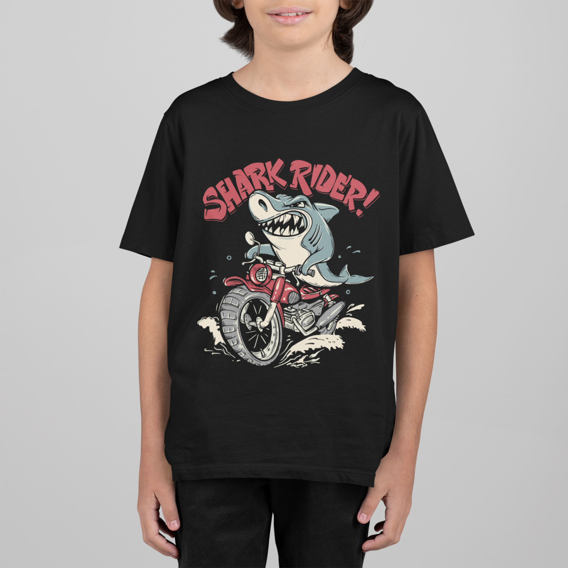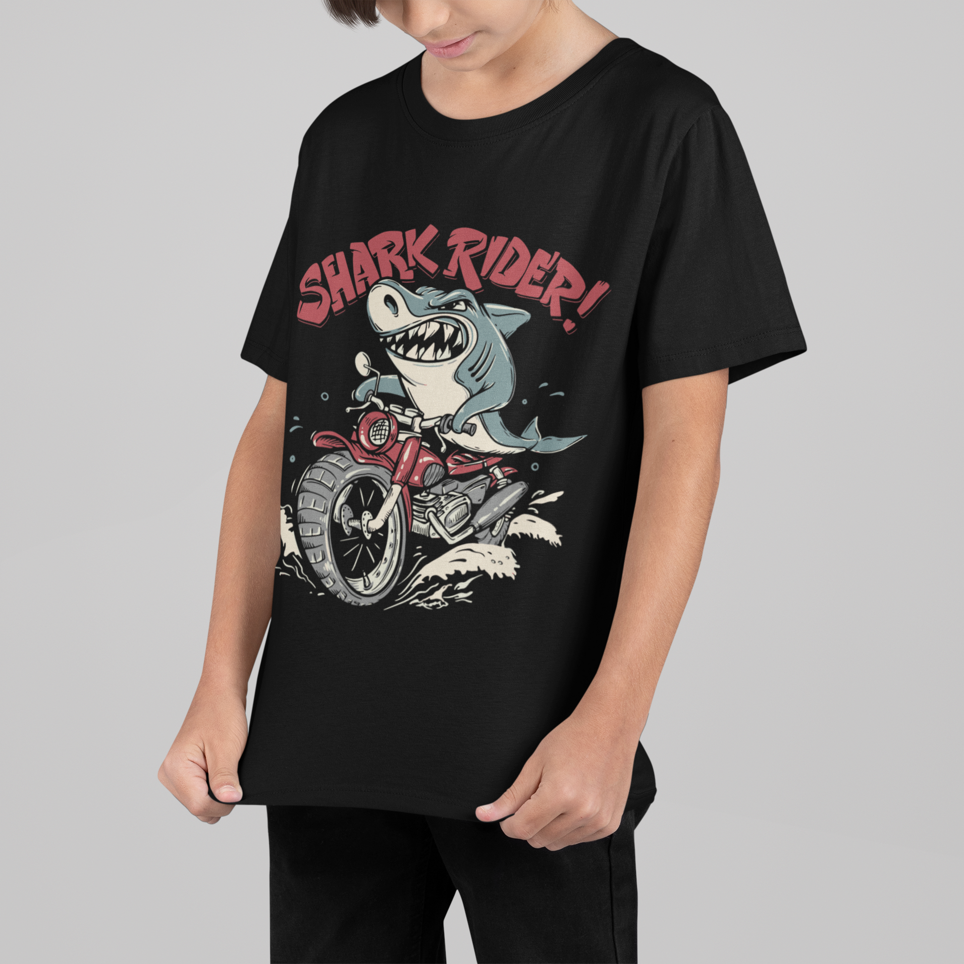 Get ready for the coolest tee in his closet! Our Shark Rider T-Shirt combines a hilarious, eye-catching design with the unbeatable comfort of 100% cotton. Perfect for the boy who loves to stand out, this shirt features a rad shark biker with a toothy grin, expertly printed in a vintage cartoon style that both kids and parents will love.