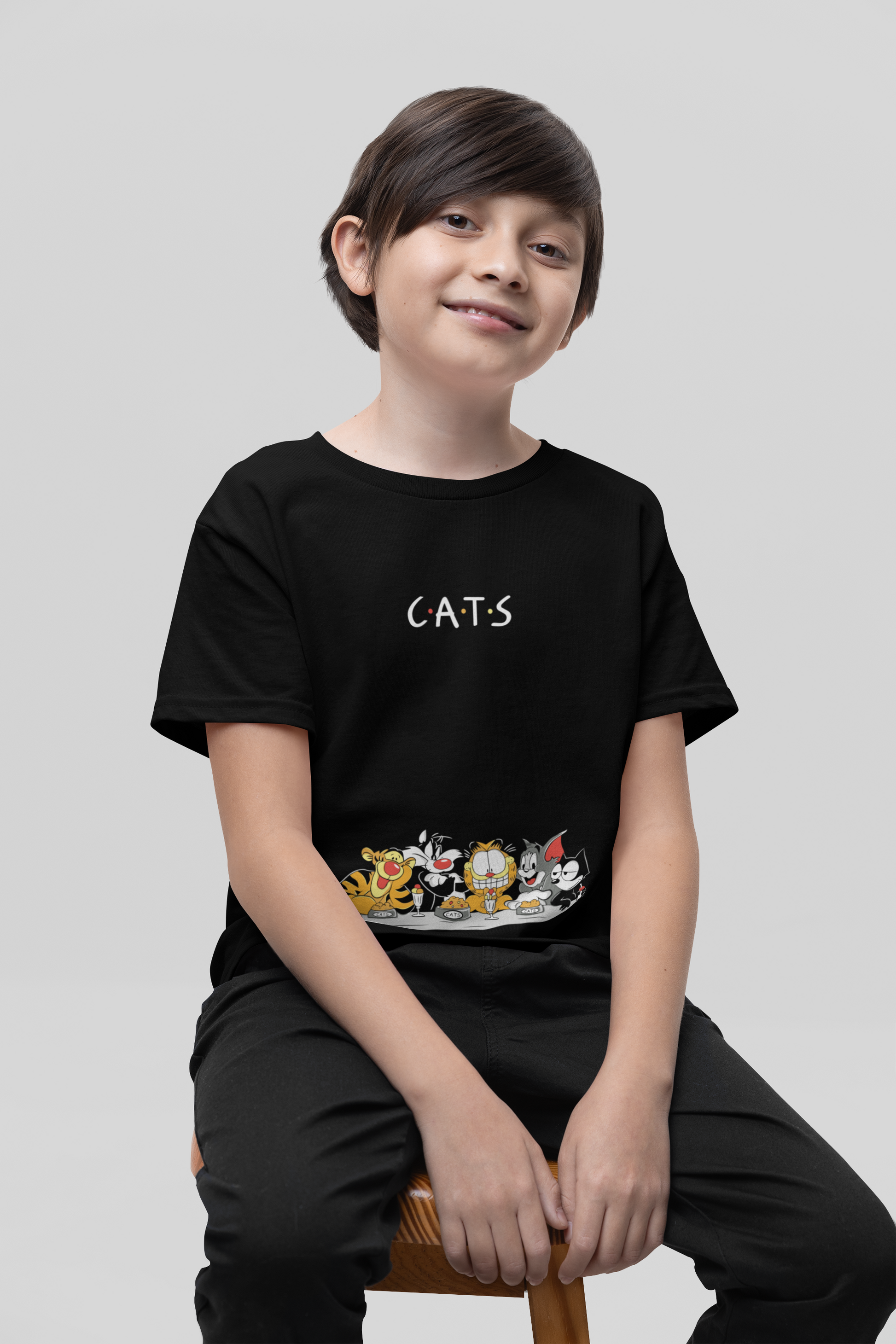 Wrap your little cat enthusiast in comfort with this premium 100% cotton black t-shirt. The eye-catching graphic brings together a dream team of beloved cartoon cats – Tigger, Sylvester, Garfield, Tom, and Felix – in a clever "CATS" Friends-inspired scene. It’s not just a t-shirt, it’s a conversation starter and a declaration of love for animated mischief. Soft, breathable, and perfect for everyday wear, this tee is sure to be a favorite.