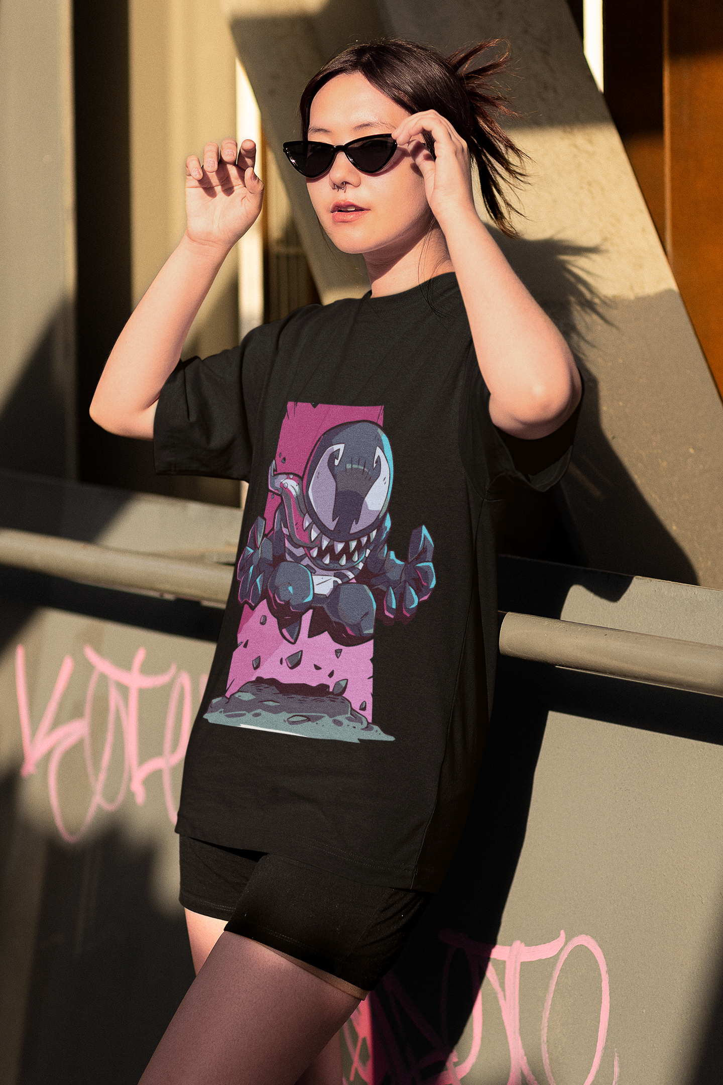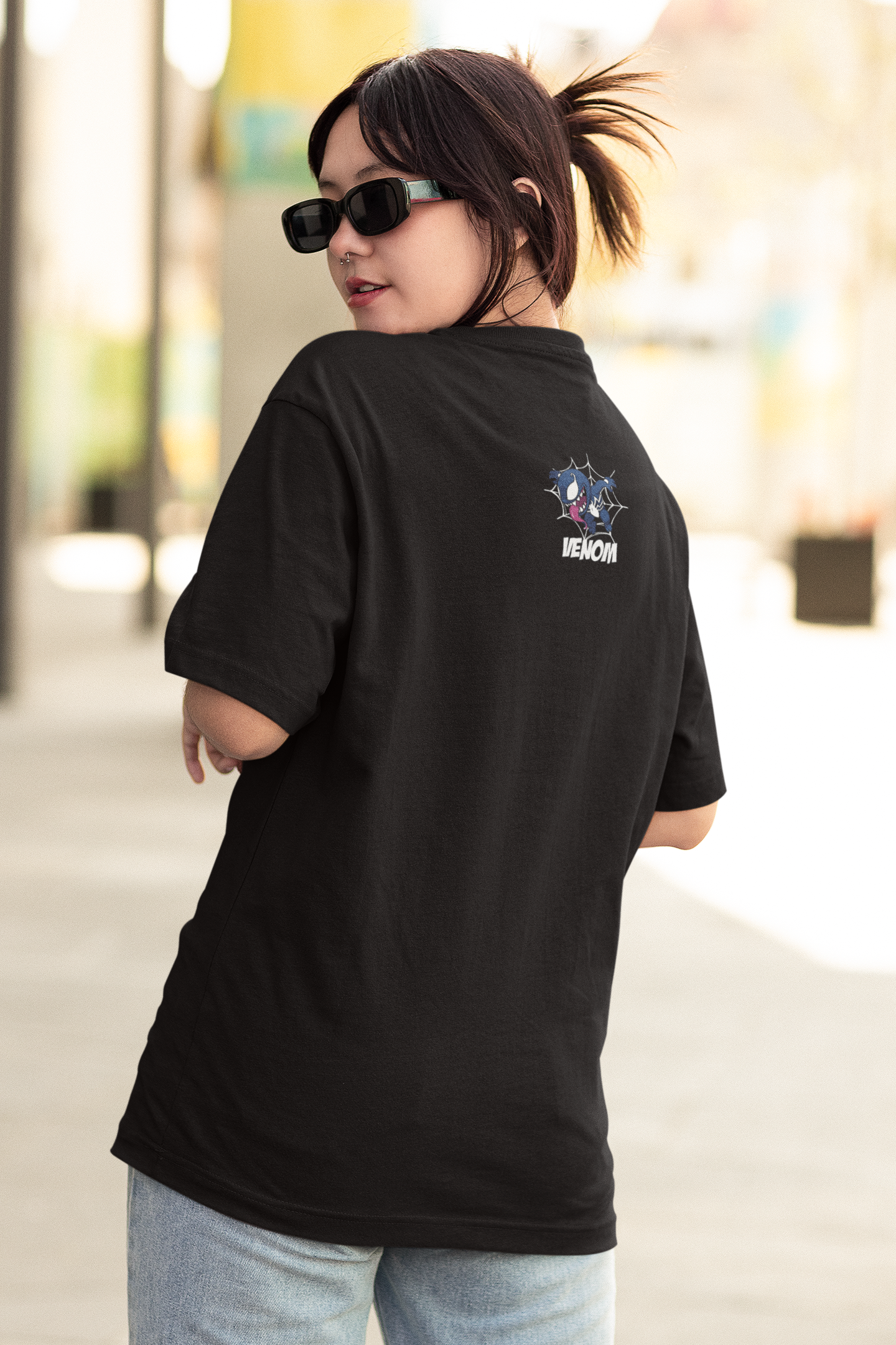 Take a walk on the wild side with our Chibi Venom Style oversized black unisex tee! Let your playful side show with this quirky and fun design that is perfect for any casual occasion. Made with high-quality materials, this tee offers both style and comfort for all-day wear.