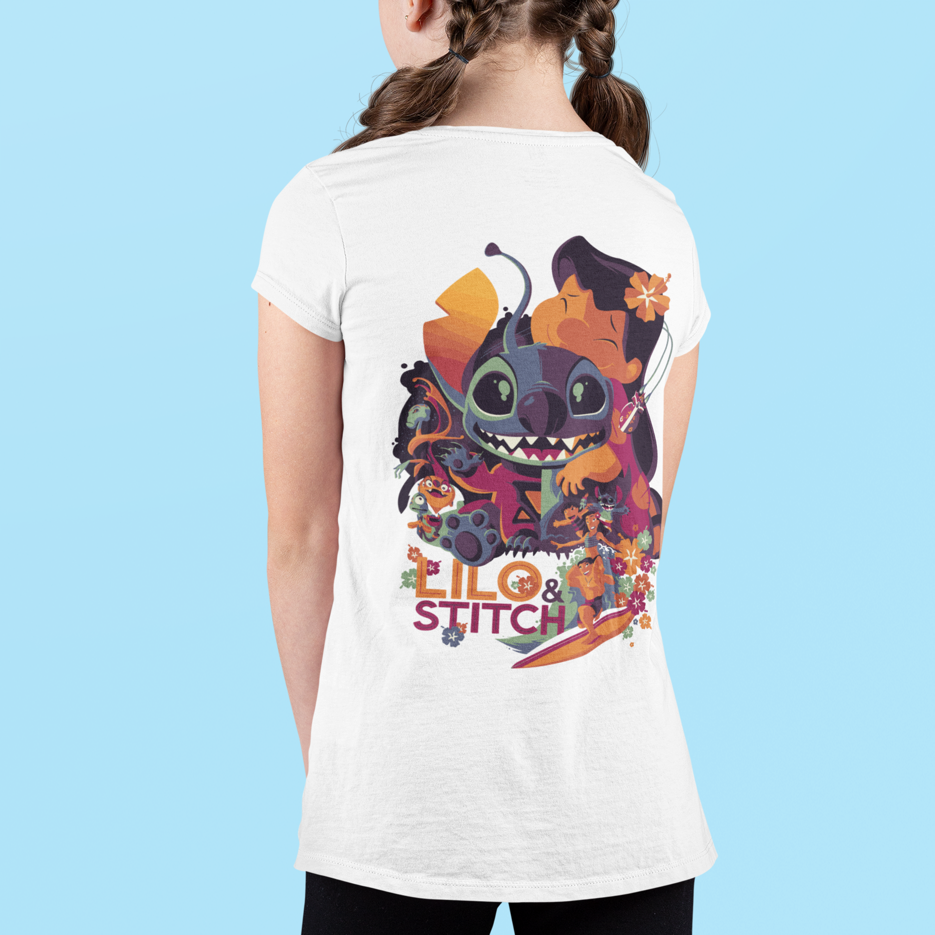 The front offers a subtle and stylish nod to the classic film with a colorful "Lilo & Stitch" logo, accented with tropical hibiscus flowers. But the real magic is on the back—a breathtaking, full-color illustration of Lilo giving her best friend, Stitch, a warm hug. This stylized, artistic design is a vibrant collage of color, tropical florals, and pure joy, capturing the heartwarming essence of "ohana means family."