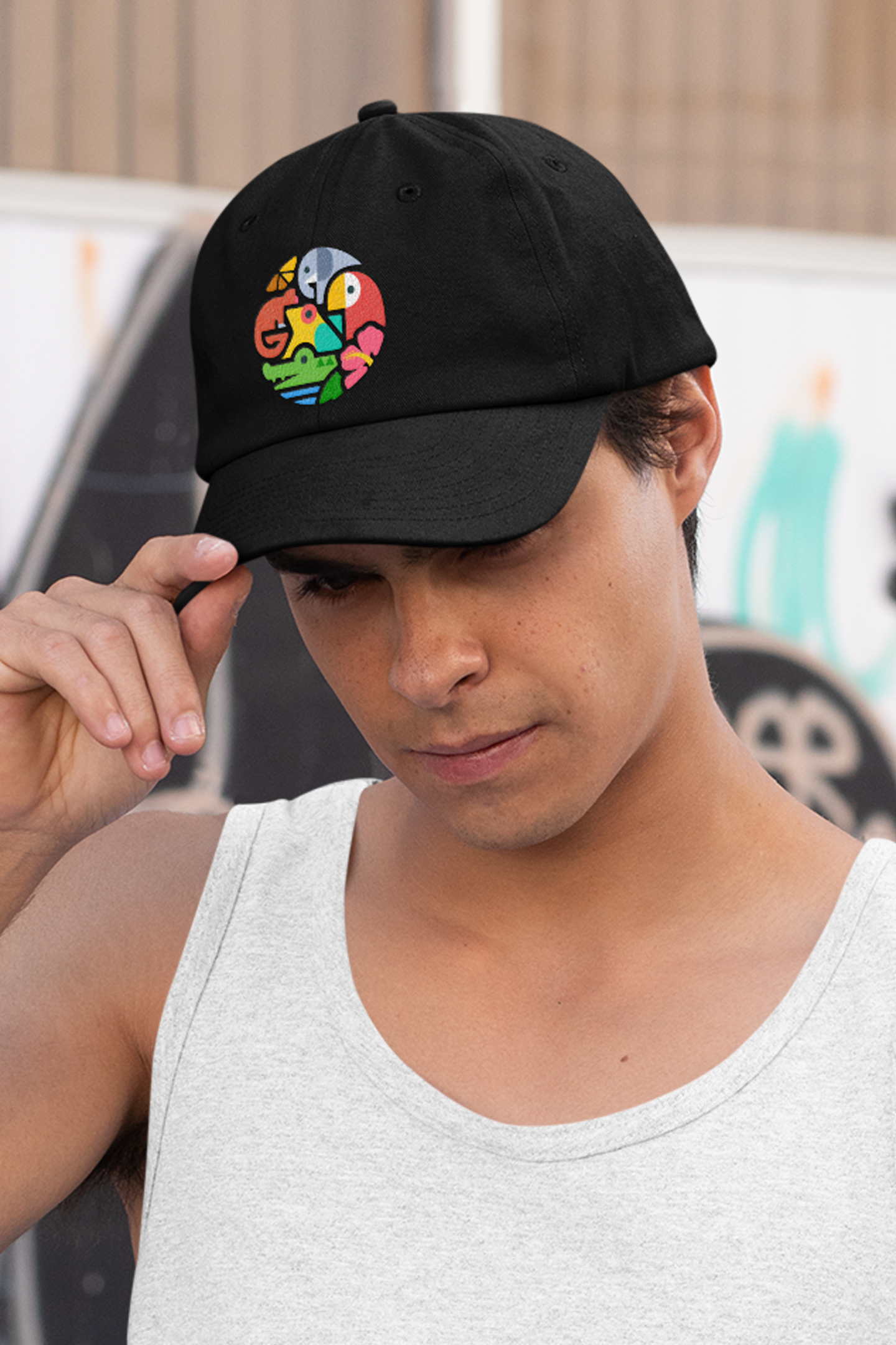 Make a statement with our black baseball cap, featuring a vibrant embroidered design of tropical animals arranged in a captivating circle. This unique piece is perfect for adding a touch of playful style to any outfit. The high-quality black fabric and comfortable fit make it an everyday essential. Stand out from the crowd and express your individuality with this eye-catching accessory.