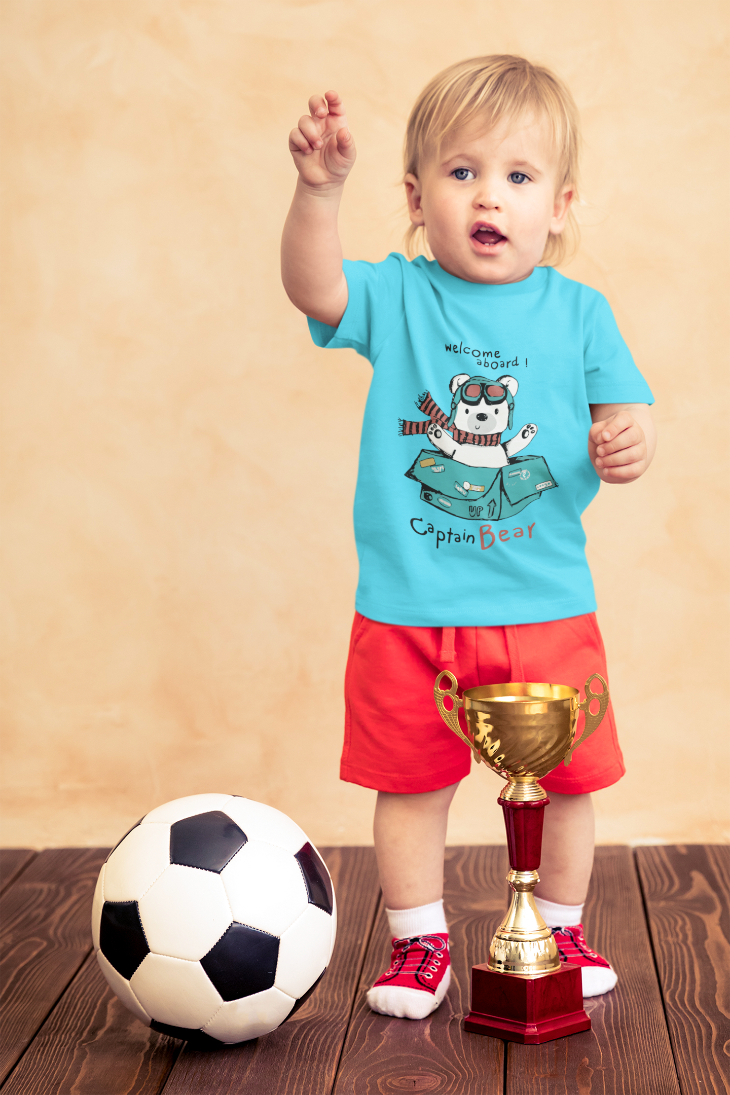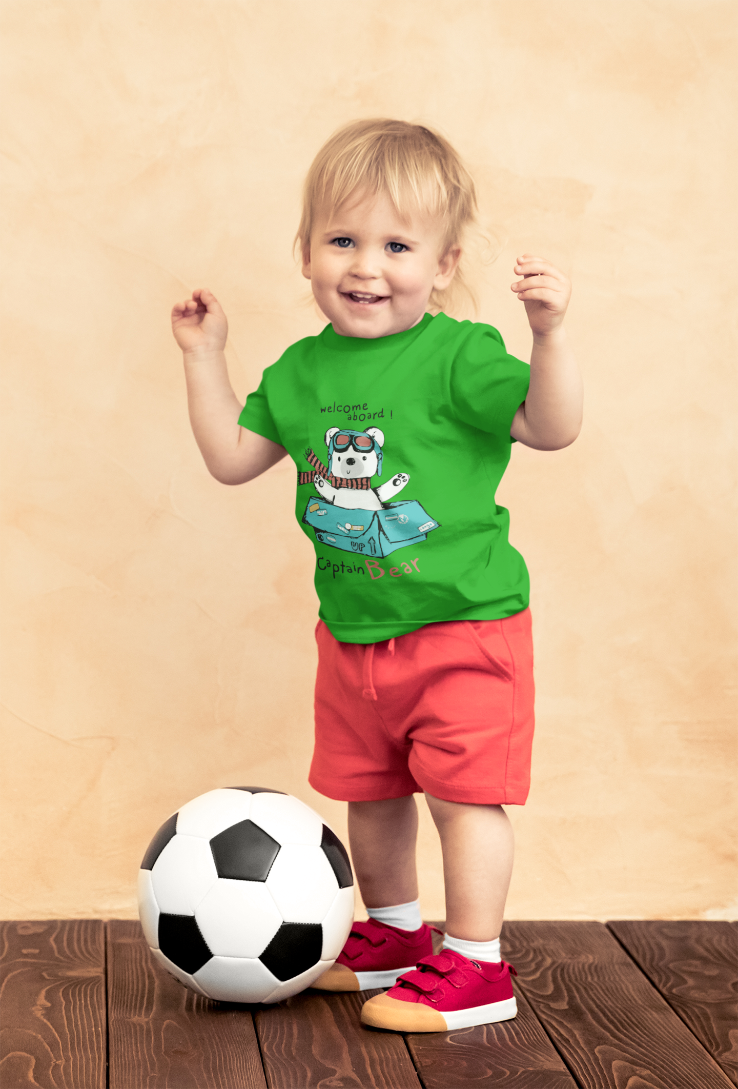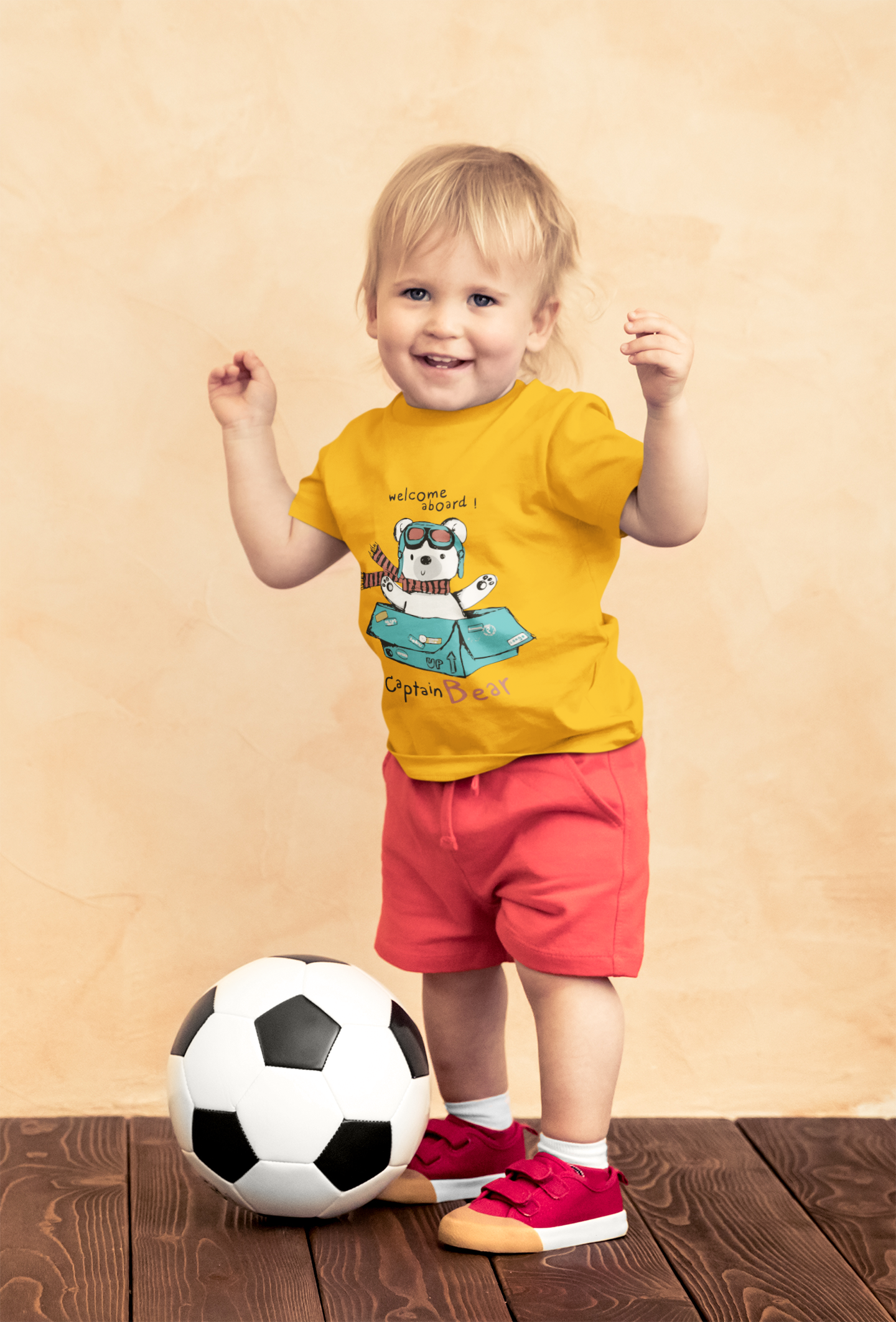 Ahoy, little adventurer! Is your toddler ready to set sail (or fly!) on a grand voyage of imagination? Then 'Welcome Aboard' this 'Captain Bear' t-shirt! Featuring an adorable bear pilot in his trusty box-plane, it's the perfect uniform for exploring new worlds (like the backyard or under the kitchen table).