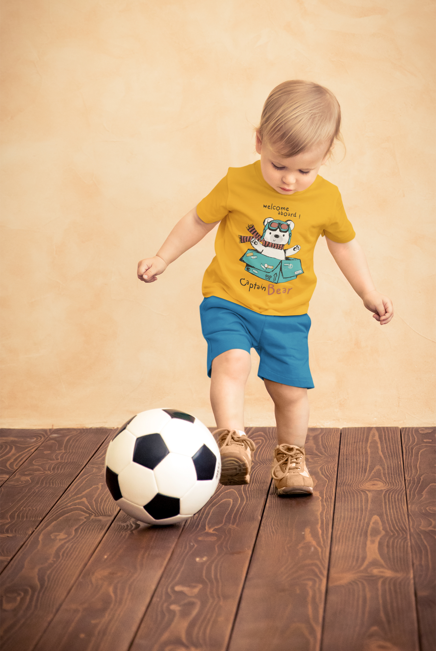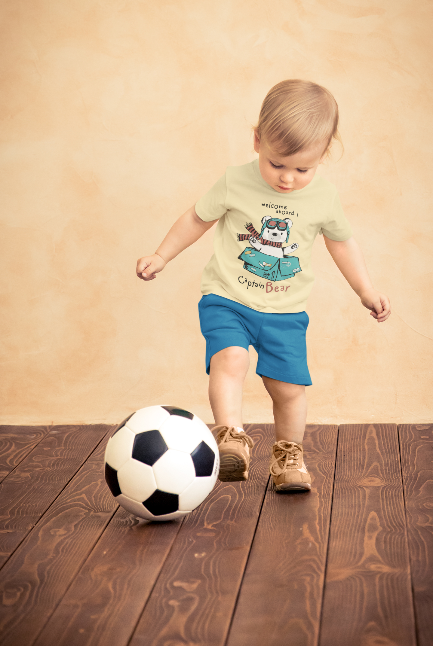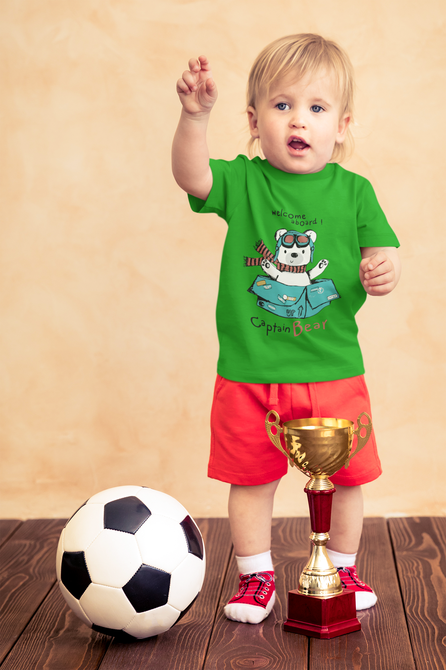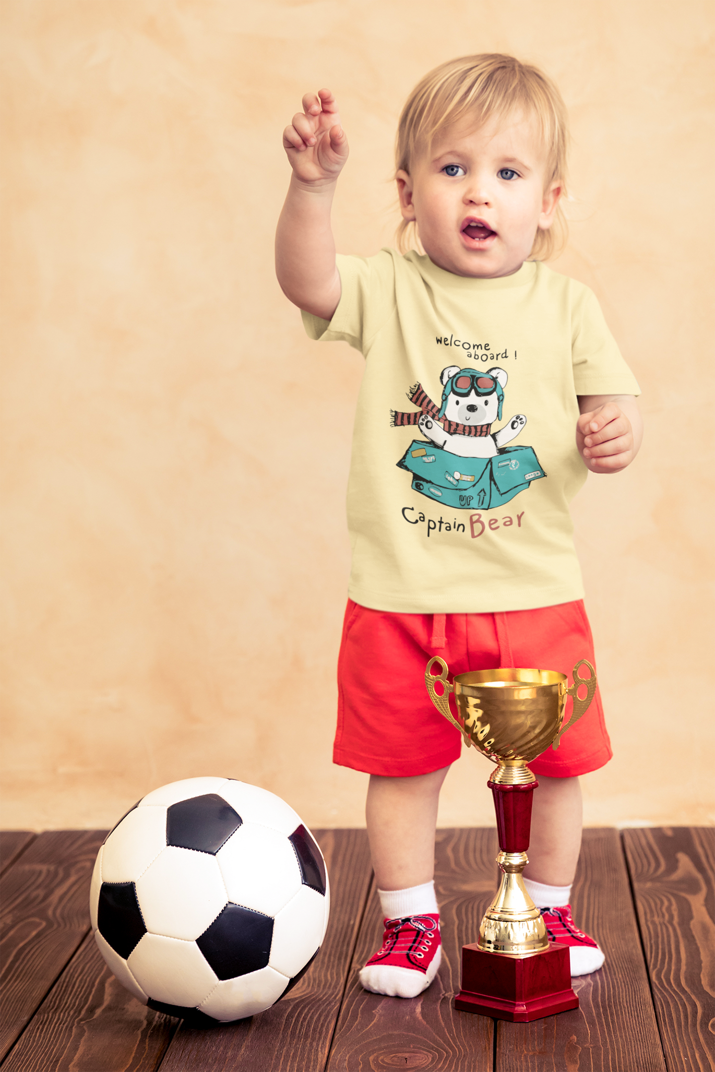 Ahoy, little adventurer! Is your toddler ready to set sail (or fly!) on a grand voyage of imagination? Then 'Welcome Aboard' this 'Captain Bear' t-shirt! Featuring an adorable bear pilot in his trusty box-plane, it's the perfect uniform for exploring new worlds (like the backyard or under the kitchen table).