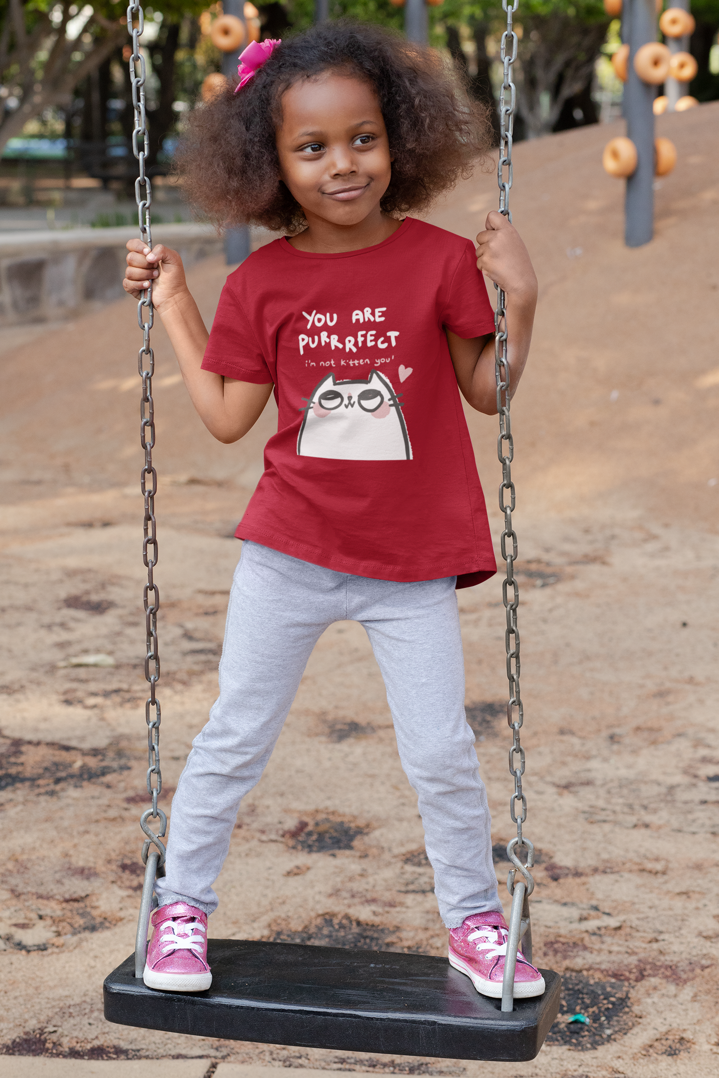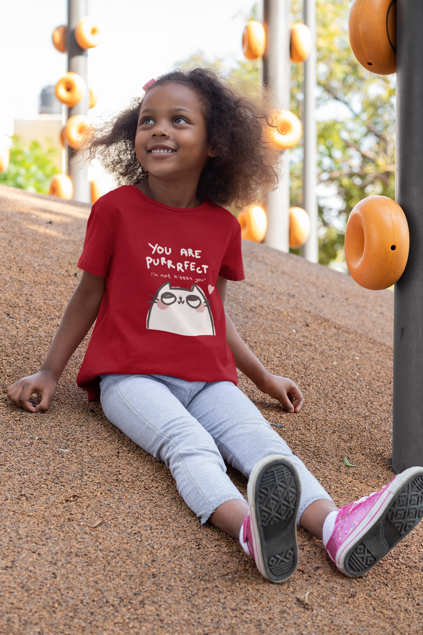 Let your little star shine in this charming red t-shirt. A sweet yet sassy white kitten takes center stage with a knowing look and a tiny heart detail. The hand-drawn style text adds to the whimsical feel, declaring "YOU ARE PURRRRFECT ('m not kitten you')!". Crafted from breathable 100% cotton, this tee is perfect for everyday adventures.