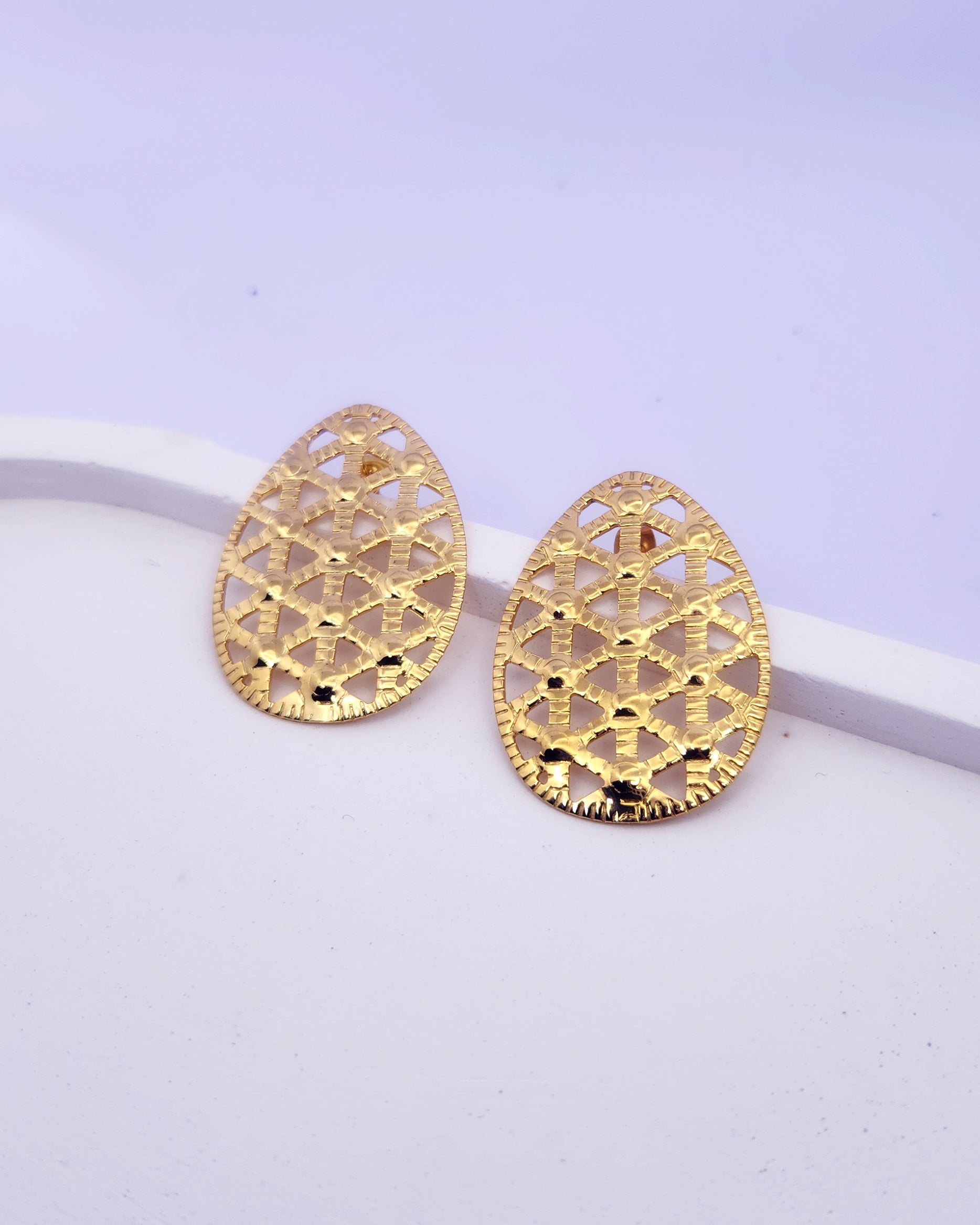 Adorn your ears with the delicate intricacy of our Golden Lace Ovals. These stunning earrings showcase a masterful openwork pattern that mimics the finest lace, captured in a polished oval form. The detailed cutouts create a lightweight feel while offering maximum visual impact, making them the ideal statement piece. A rich 18 karat gold plating provides a warm, luminous finish that's protected by an anti-tarnish layer for enduring beauty. Crafted to be hypoallergenic, they offer a touch of glamour that's gentle on even the most sensitive skin.