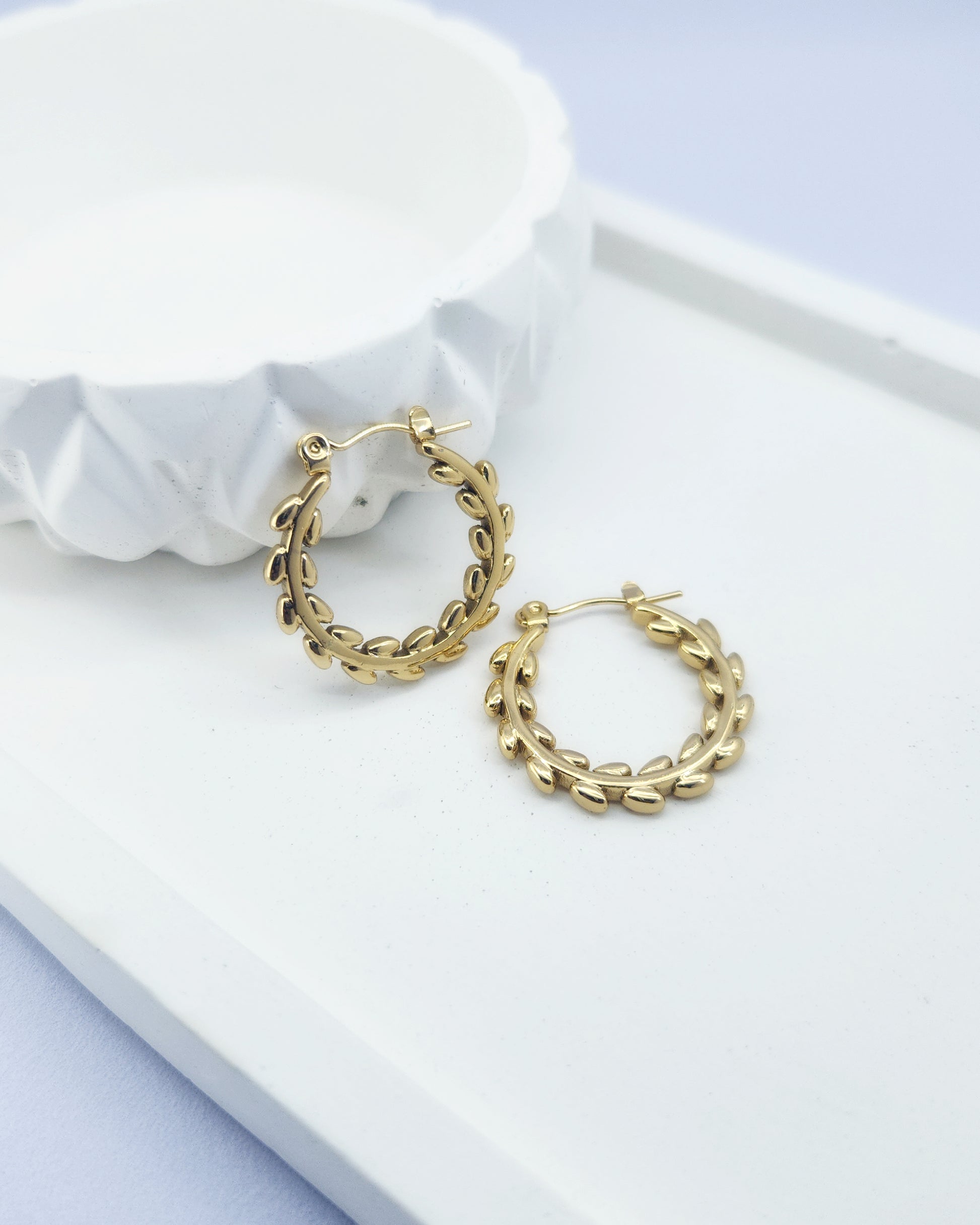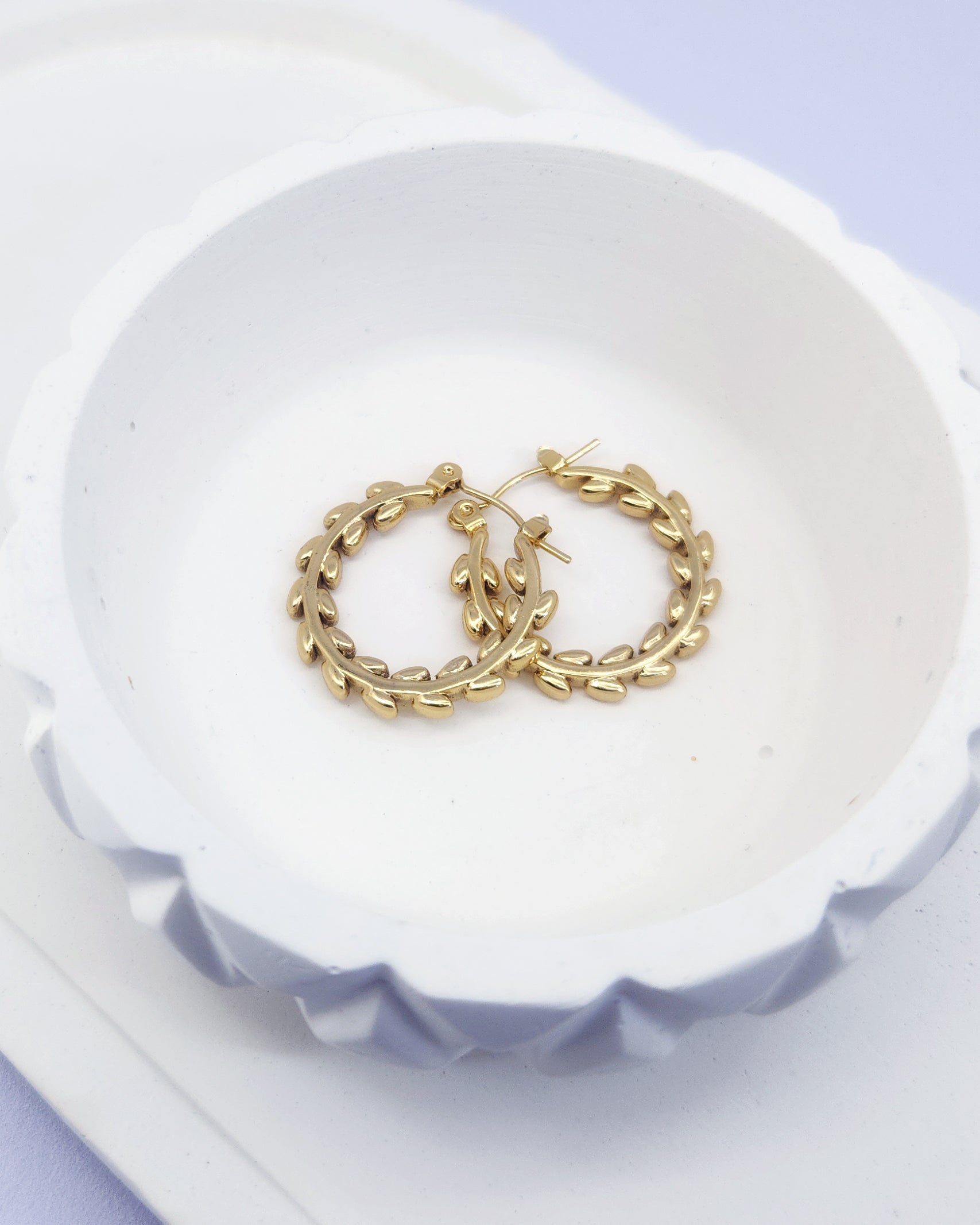 Wrap yourself in the timeless elegance of our Golden Vine Hoops. Inspired by the classic laurel wreath, a symbol of honor and victory, these earrings feature a delicate garland of polished leaves that gracefully encircle the hoop. Each leaf is designed to catch the light, creating a subtle, radiant shimmer with every movement.
