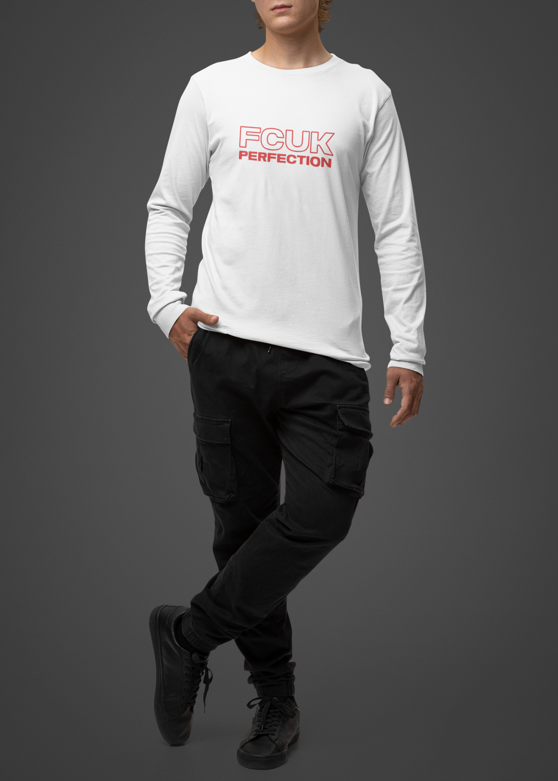 Embrace your authentic self with this striking long-sleeve t-shirt crafted from breathable pure cotton. The back features a bold, artistic graphic that plays with the concept of perfection, incorporating floral sketches and empowering handwritten phrases like "be imperfect" and "be yourself!" The front offers a subtle contrast with a clean "FCUK PERFECTION" design. This unique tee is more than just clothing; it's a wearable statement about embracing individuality and living life to the fullest. Perfect for adding an edgy yet comfortable touch to your casual wardrobe.