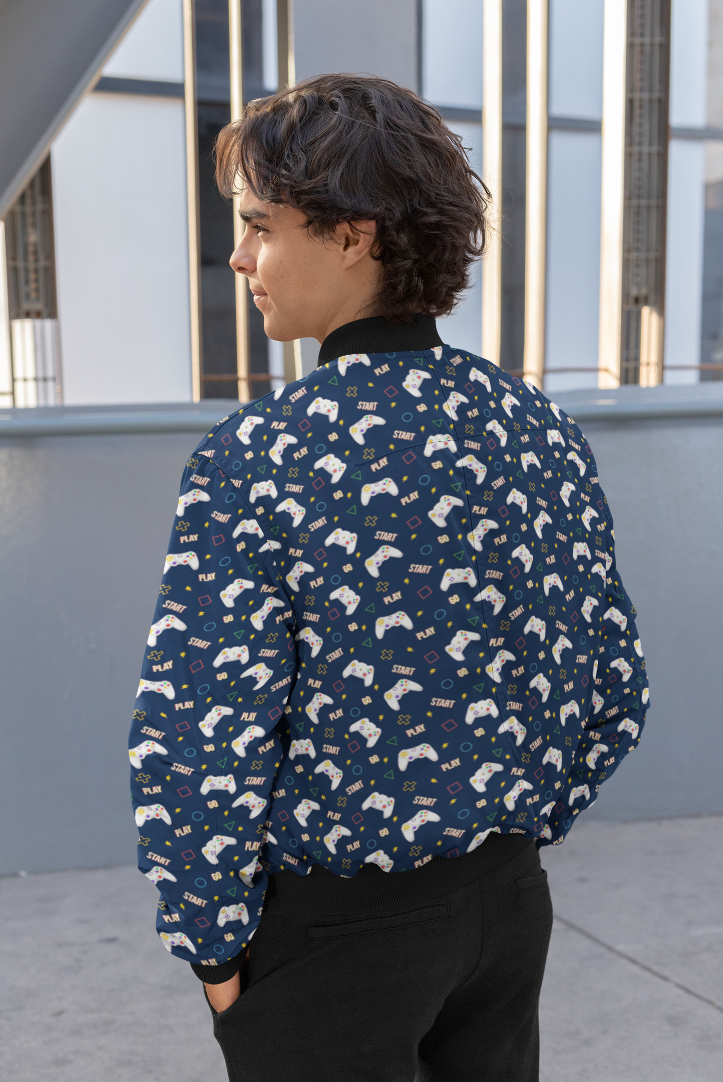 Level Up: Gamer's Blue Game Controller Print Bomber Jacket