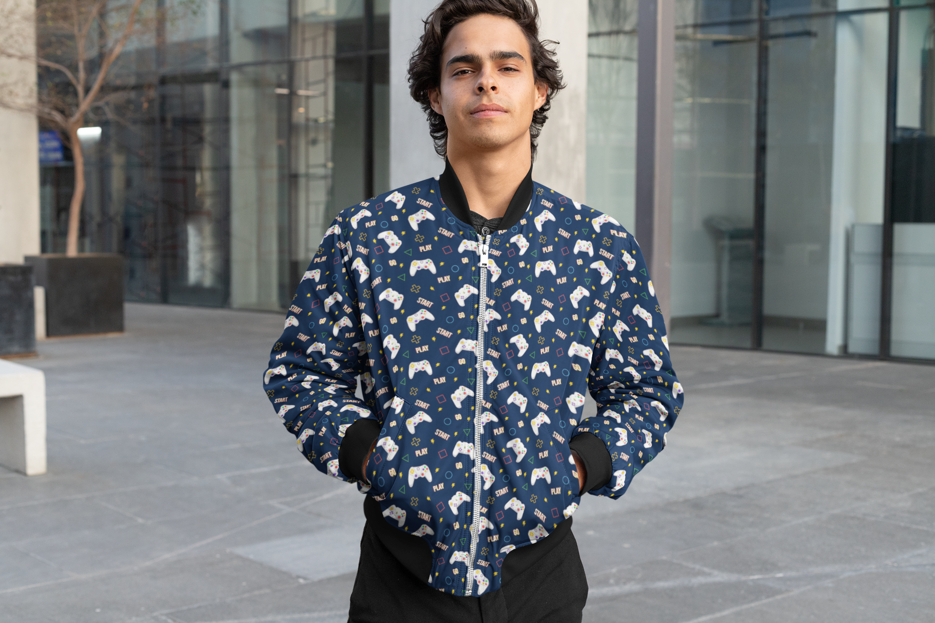Get ready to level up your fashion game with this bomber jacket featuring a striking blue game controller print. Made for gamers, by gamers, this jacket is not only stylish but also a nod to your passion for gaming. Stay warm and trendy with Level Up!
