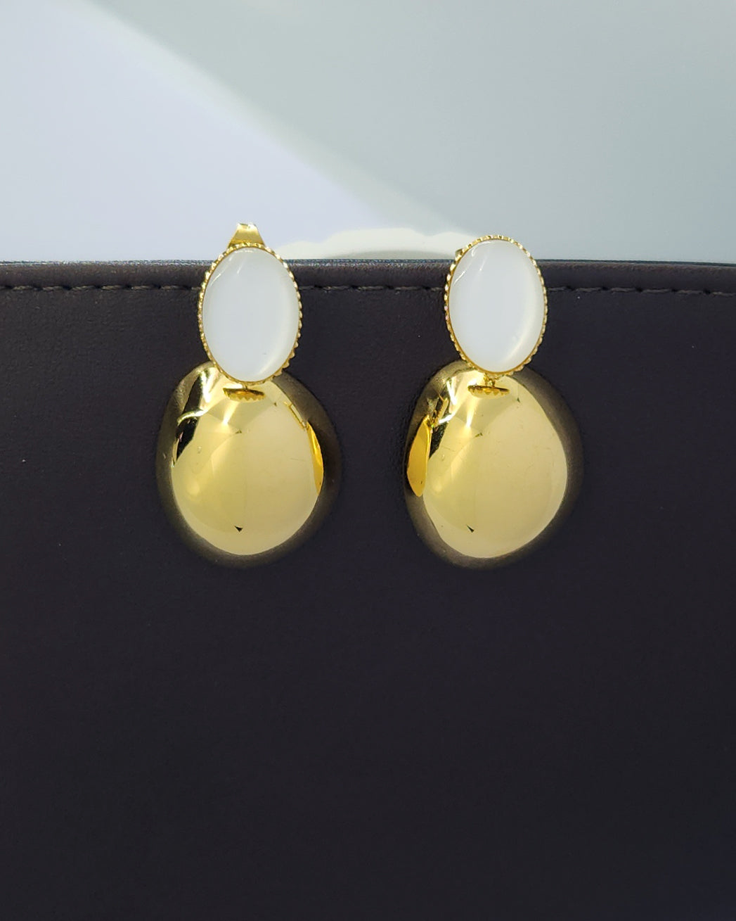 Discover the beauty of imperfect harmony. Our Luminous Pebble Drop earrings feature a stunning contrast between an ethereal, glowing cabochon stone and a highly polished, free-form gold pebble. The top stone, reminiscent of moonstone, is set in a delicate bezel, while the golden drop below is sculpted to look like a liquid-smooth nugget, catching the light with its brilliant surface.