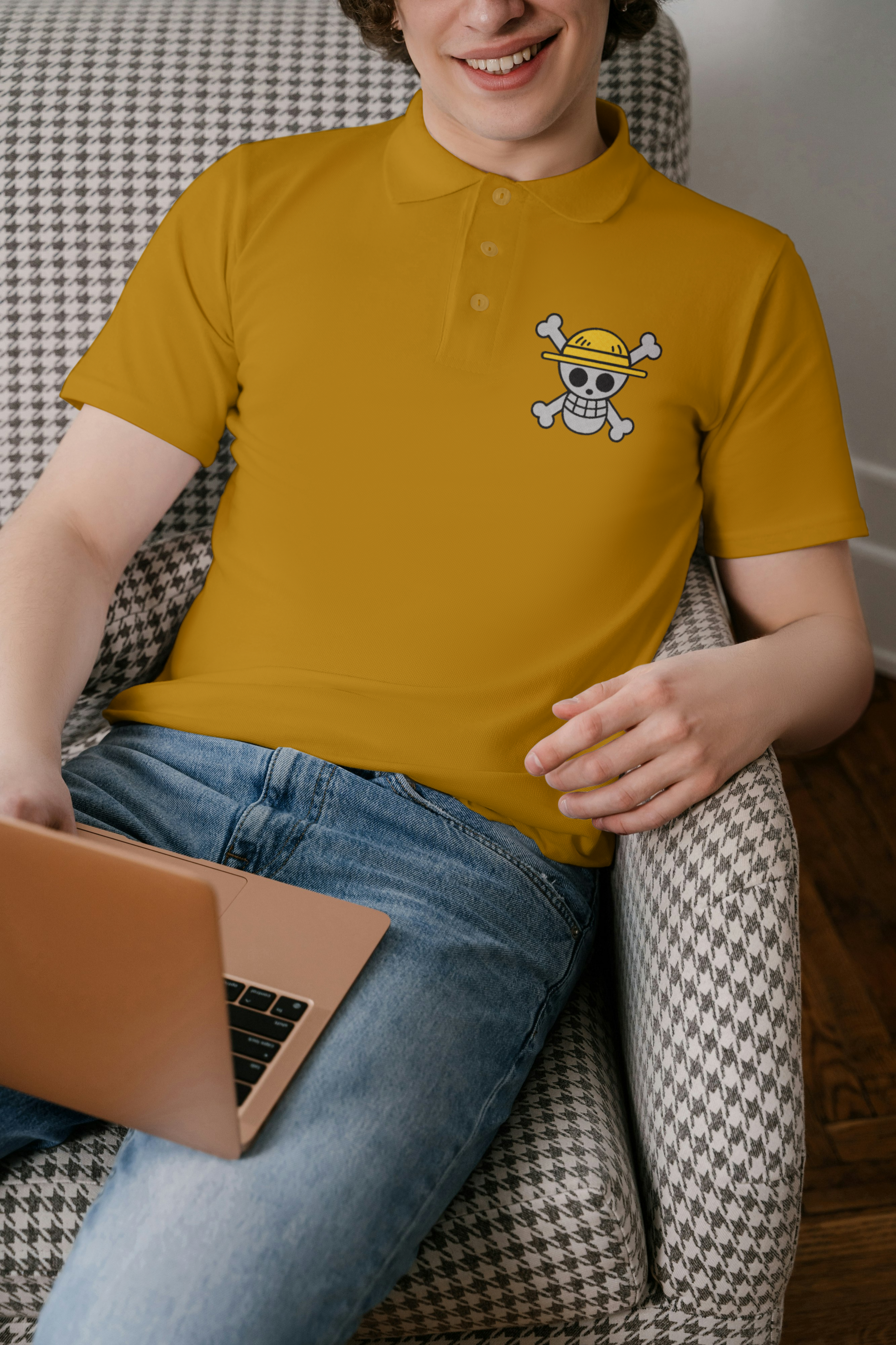 Mustard Yellow Polo with One Piece-Inspired Straw Hat Pirate Logo – Bold & Fashionable