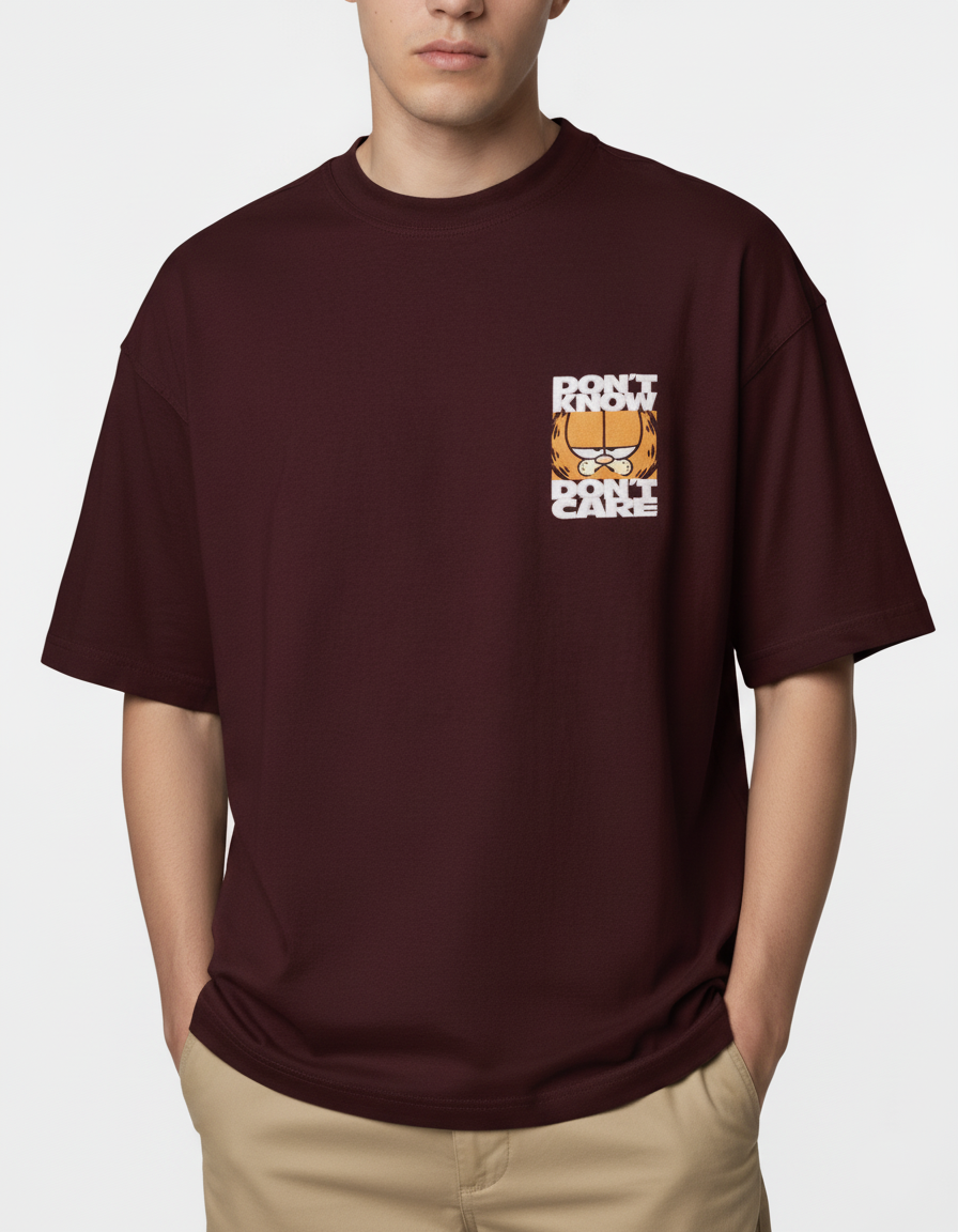 The star of the show is the expertly embroidered Garfield on the chest, complete with his signature "DON'T KNOW DON'T CARE" mantra. It’s a fun, stylish tribute to the world's favourite lazy cat, perfect for adding a pop of personality to your look. The deep maroon hue and relaxed fit make it the ultimate go-to for effortless style.