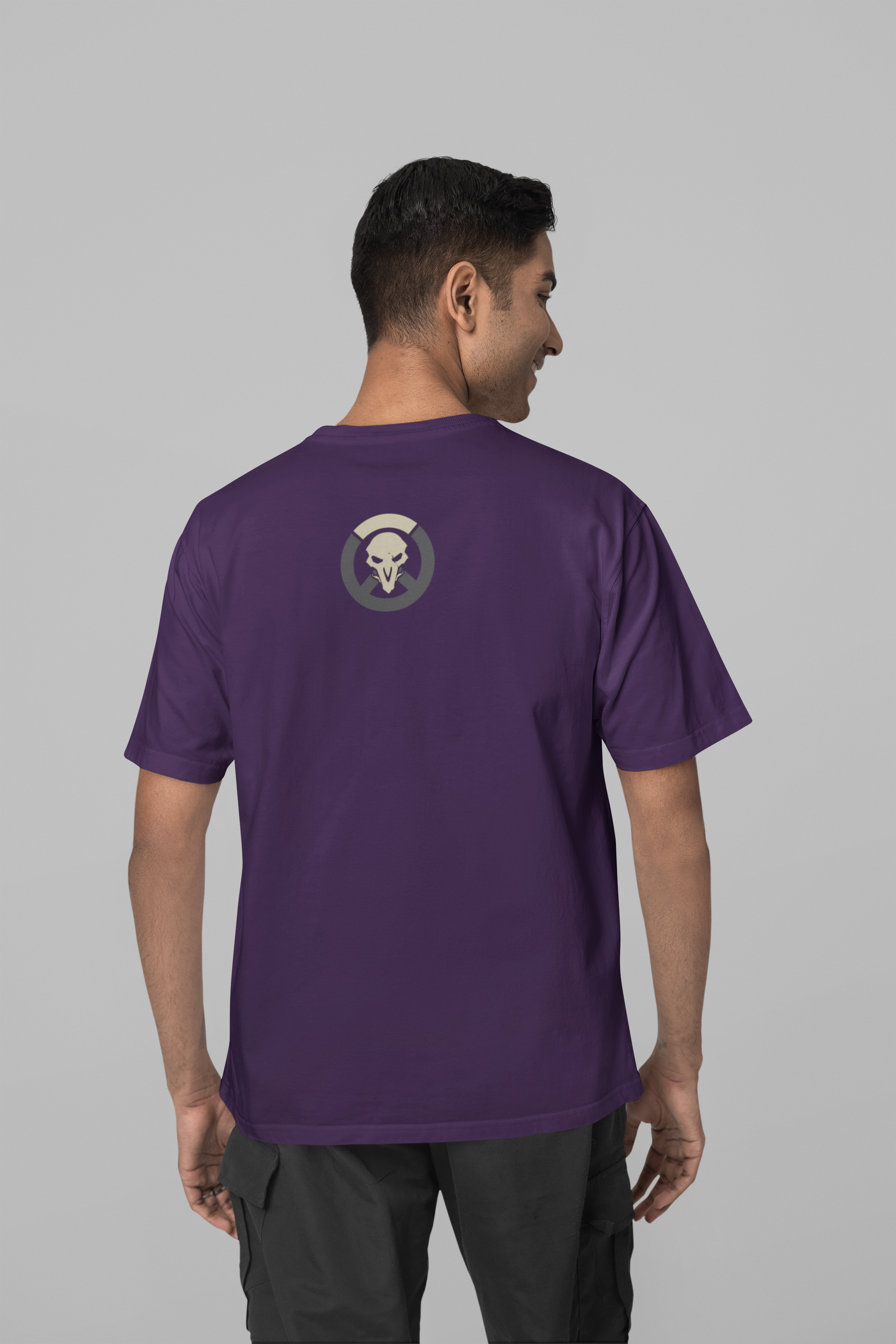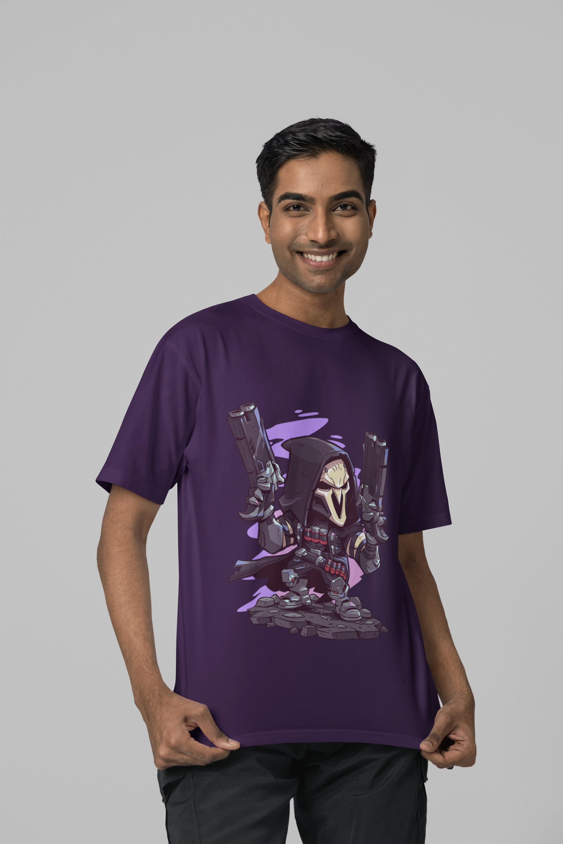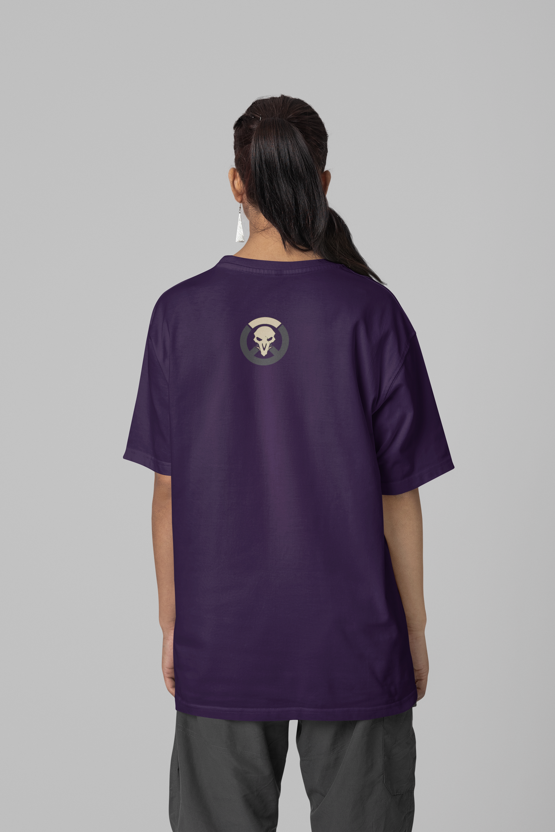 Unleash your inner Reaper with this oversized purple unisex t-shirt featuring a playful chibi design of your favorite Overwatch character. Made for both men and women, this shirt is perfect for any fan looking for a unique and quirky addition to their wardrobe. (No edgelords allowed.)