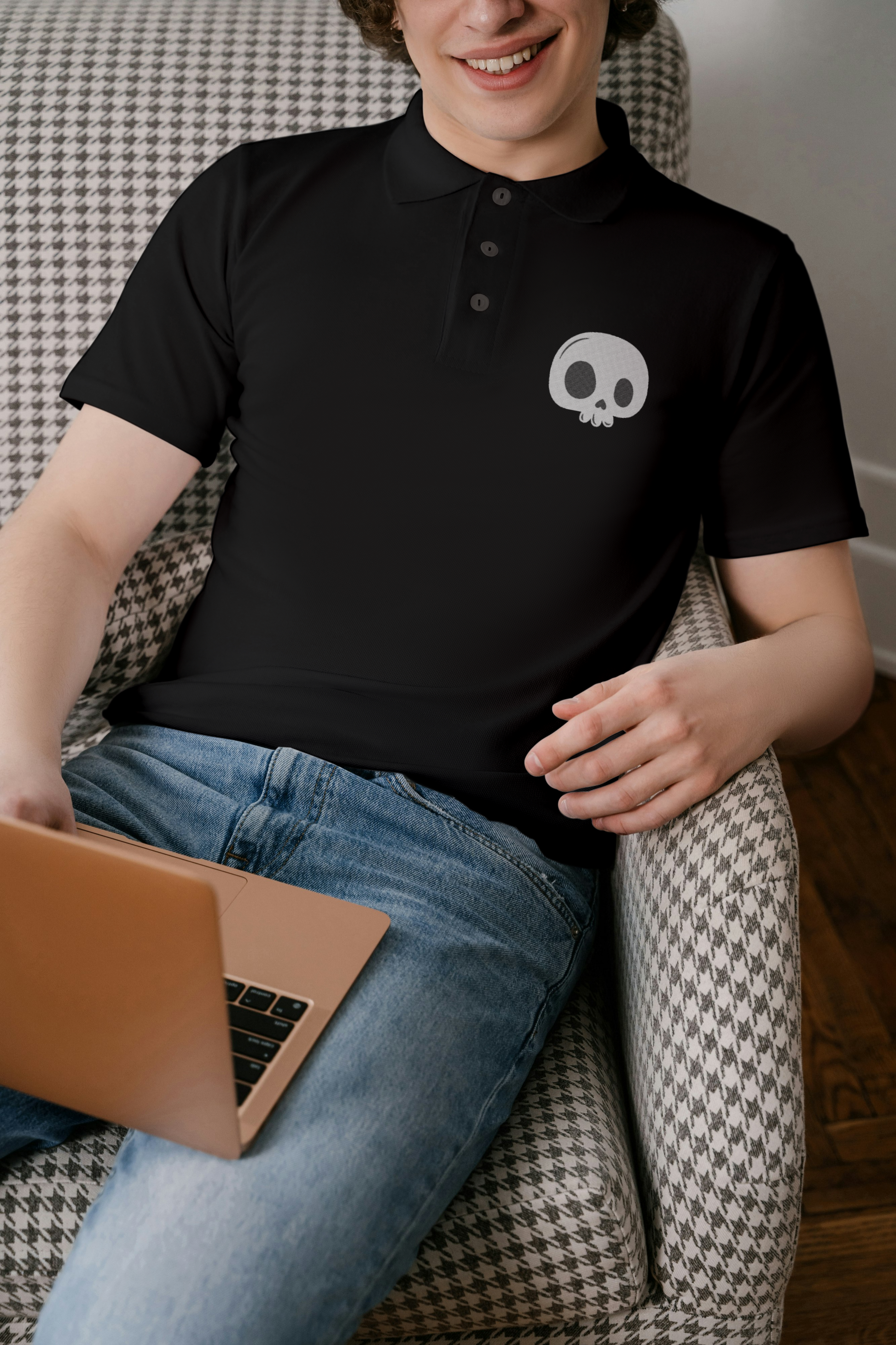 Skull Meets Cute – Black Polo with Fun cartoony Skull Embroidery