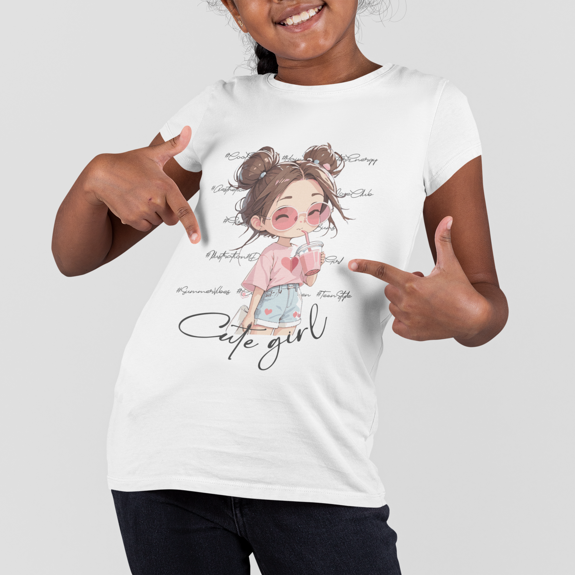 Unleash her inner trendsetter with this absolutely adorable "Cute Girl" graphic tee! Featuring a stylish, hand-drawn style character with trendy space buns and cool pink shades, this shirt is all about celebrating fun and confidence. She’s even sipping a smoothie—capturing those perfect, sunny-day vibes.
