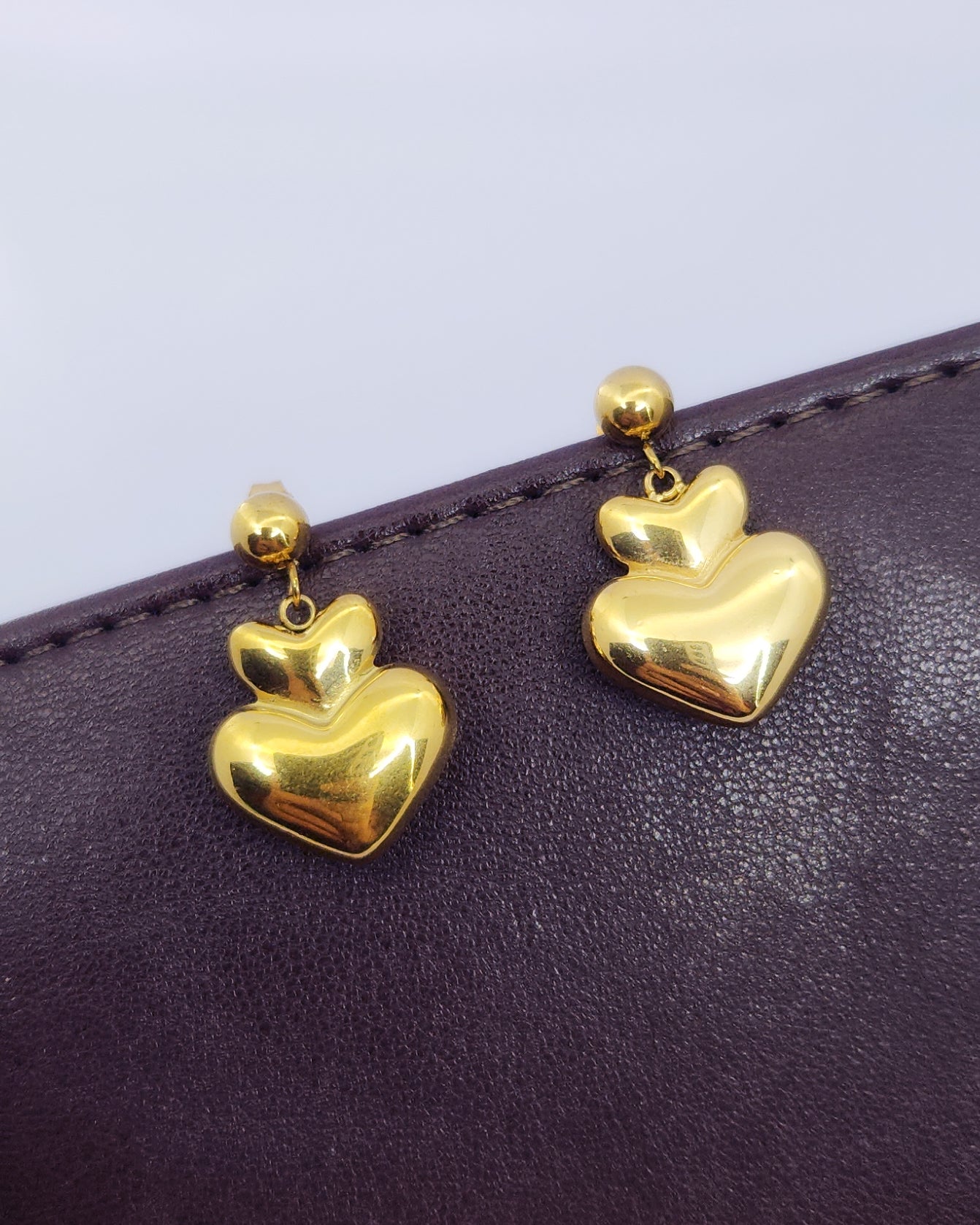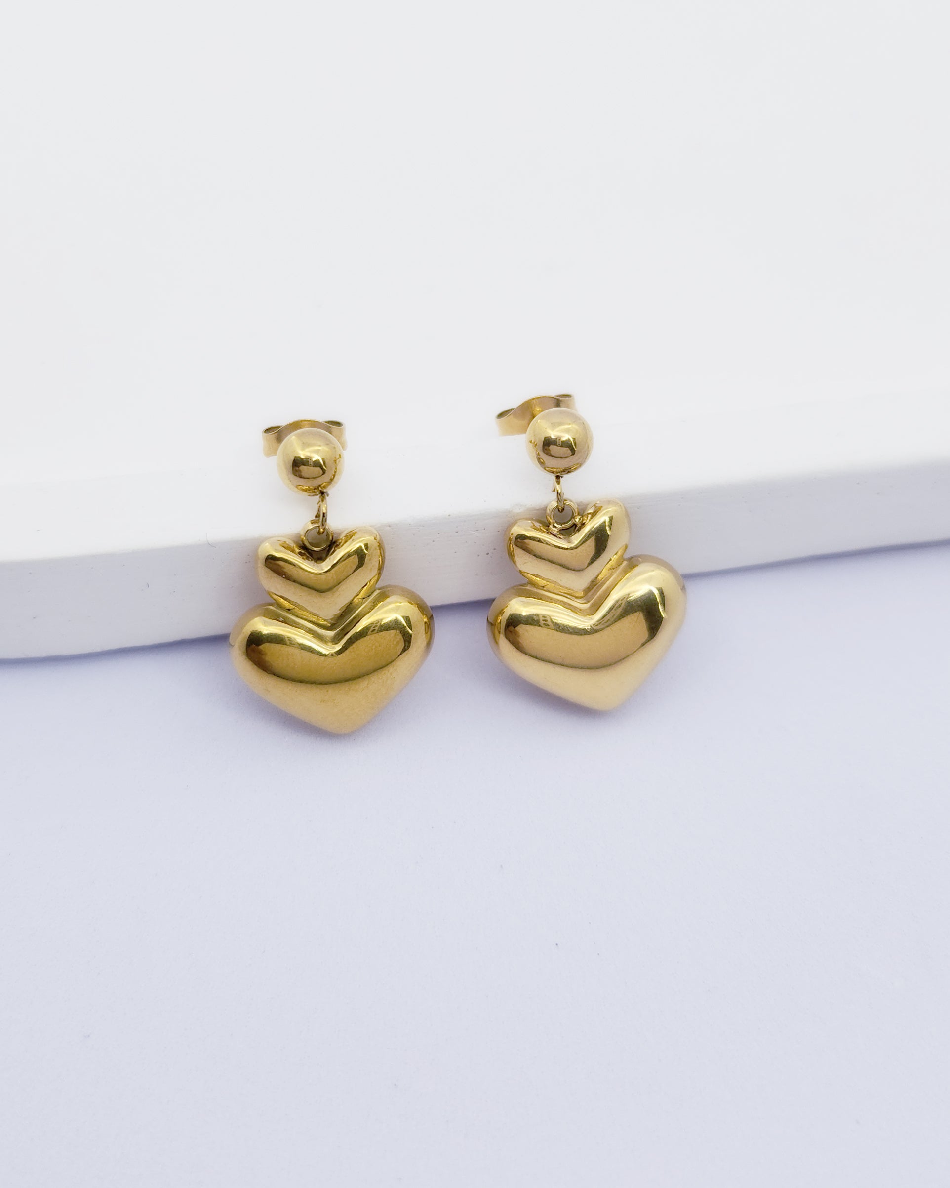 Fall in love with a classic, reimagined. Our Amore Drop Earrings feature a charming duo of beautifully sculpted hearts, cascading from a polished golden stud. The stacked, puffy design creates a sense of playful dimension and catches the light with every turn of your head.