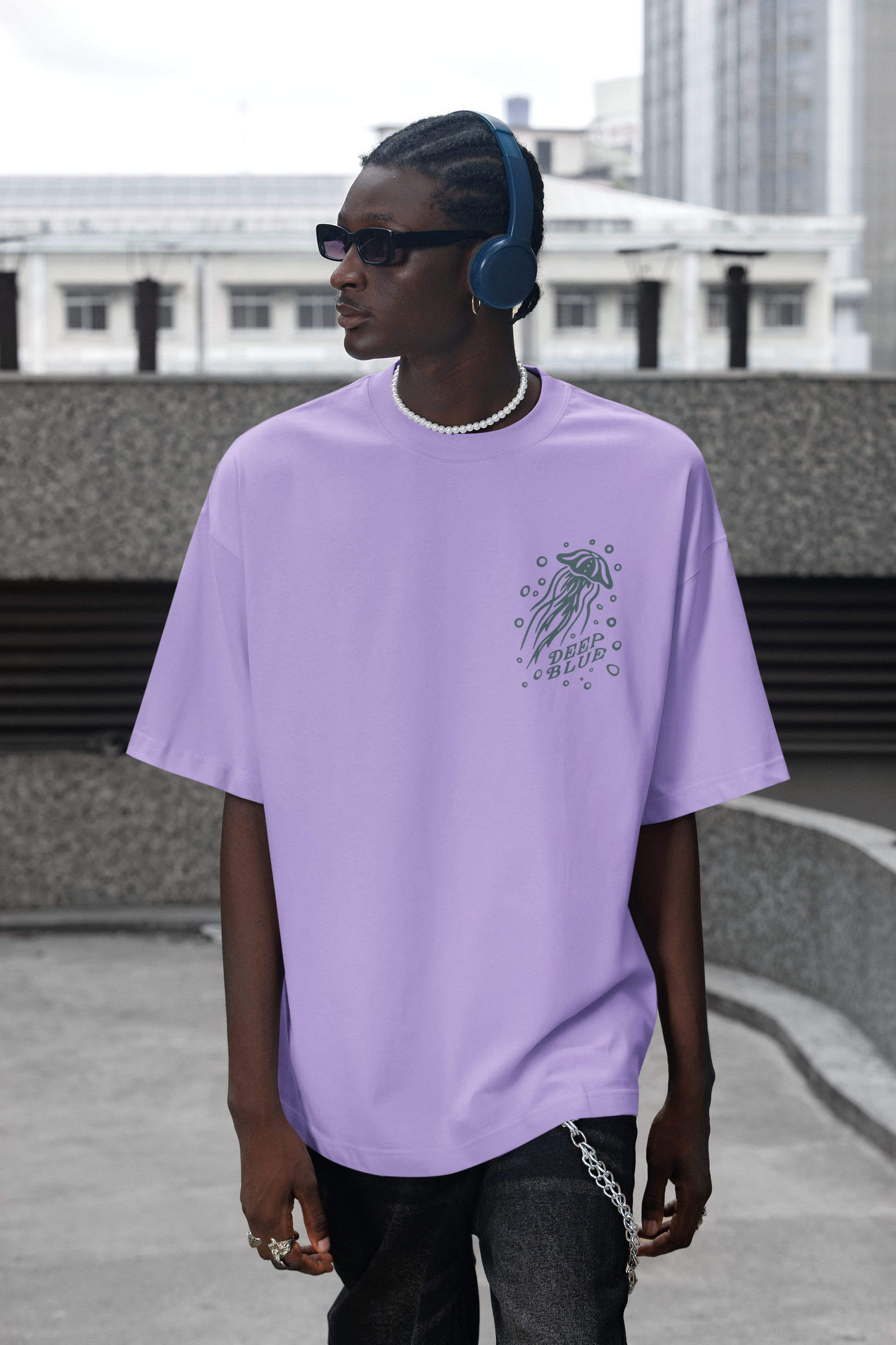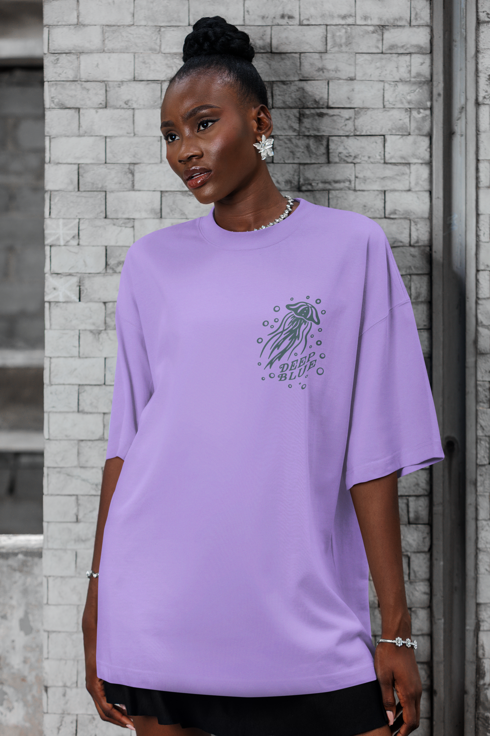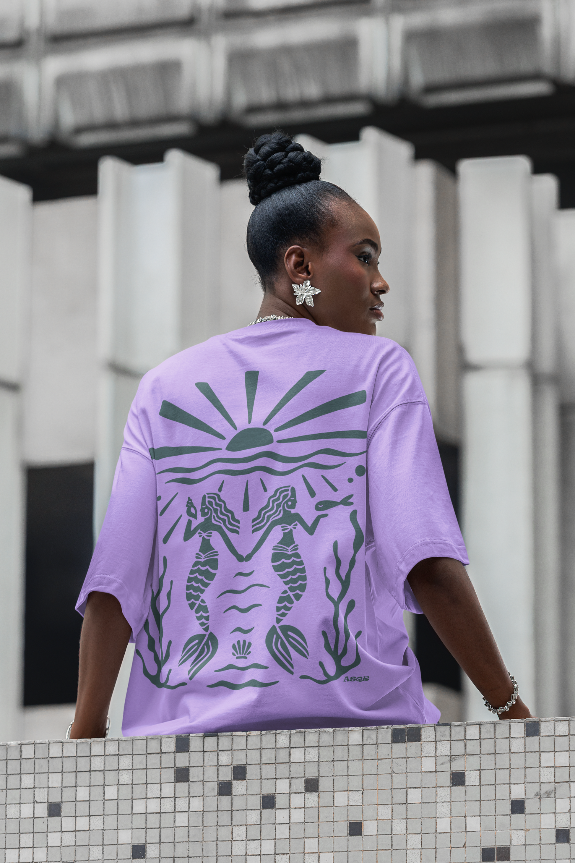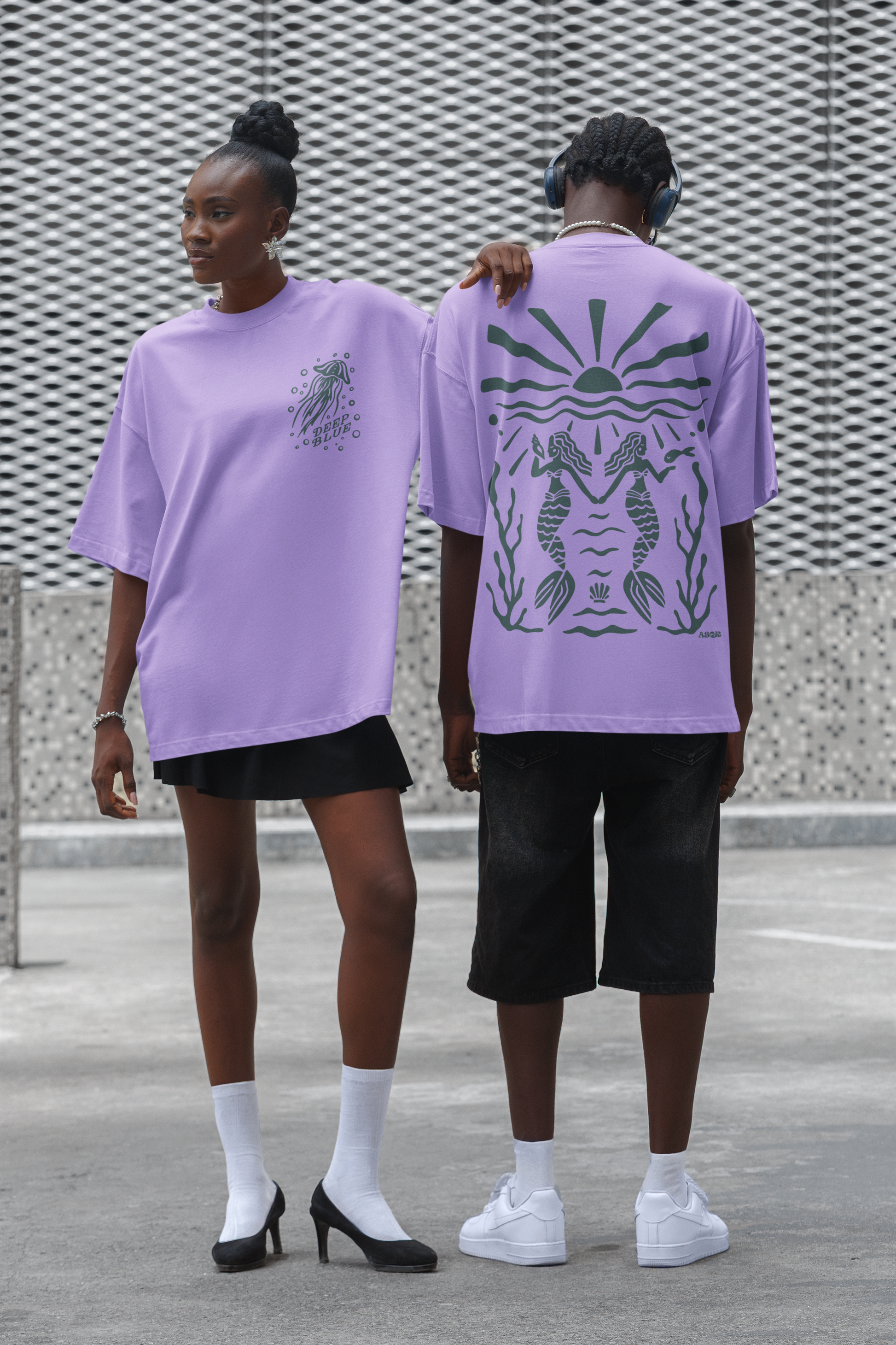 Set against a perfectly faded lavender, the oversized cut delivers on-trend comfort and a relaxed vibe. The magic is in the details: a subtle jellyfish graphic with "DEEP BLUE" text on the chest gives a nod to what's on the back—a stunning, full-panel linocut-style mermaid print that's pure artistry.