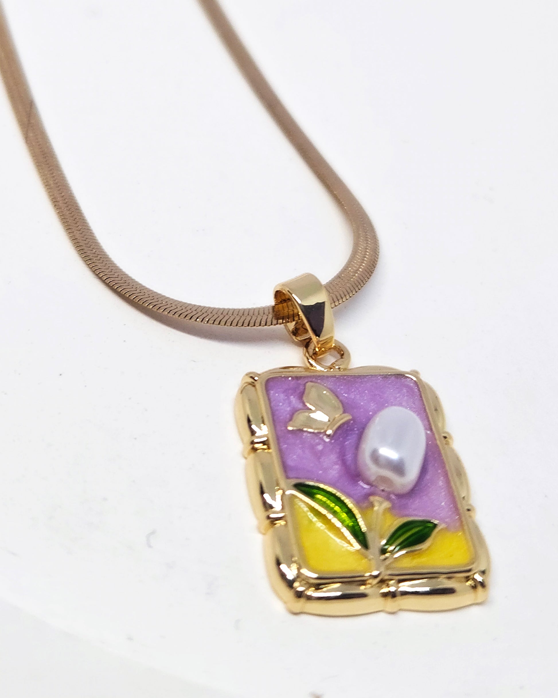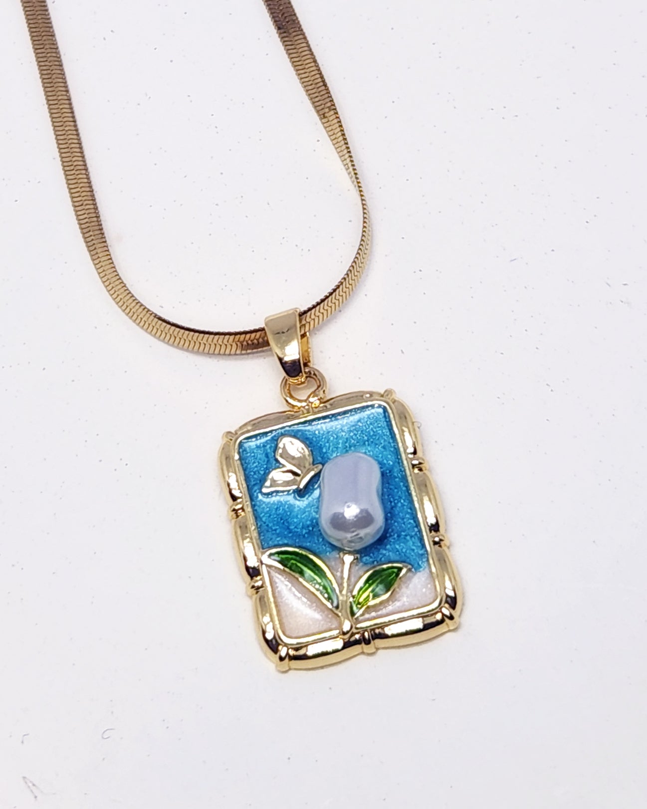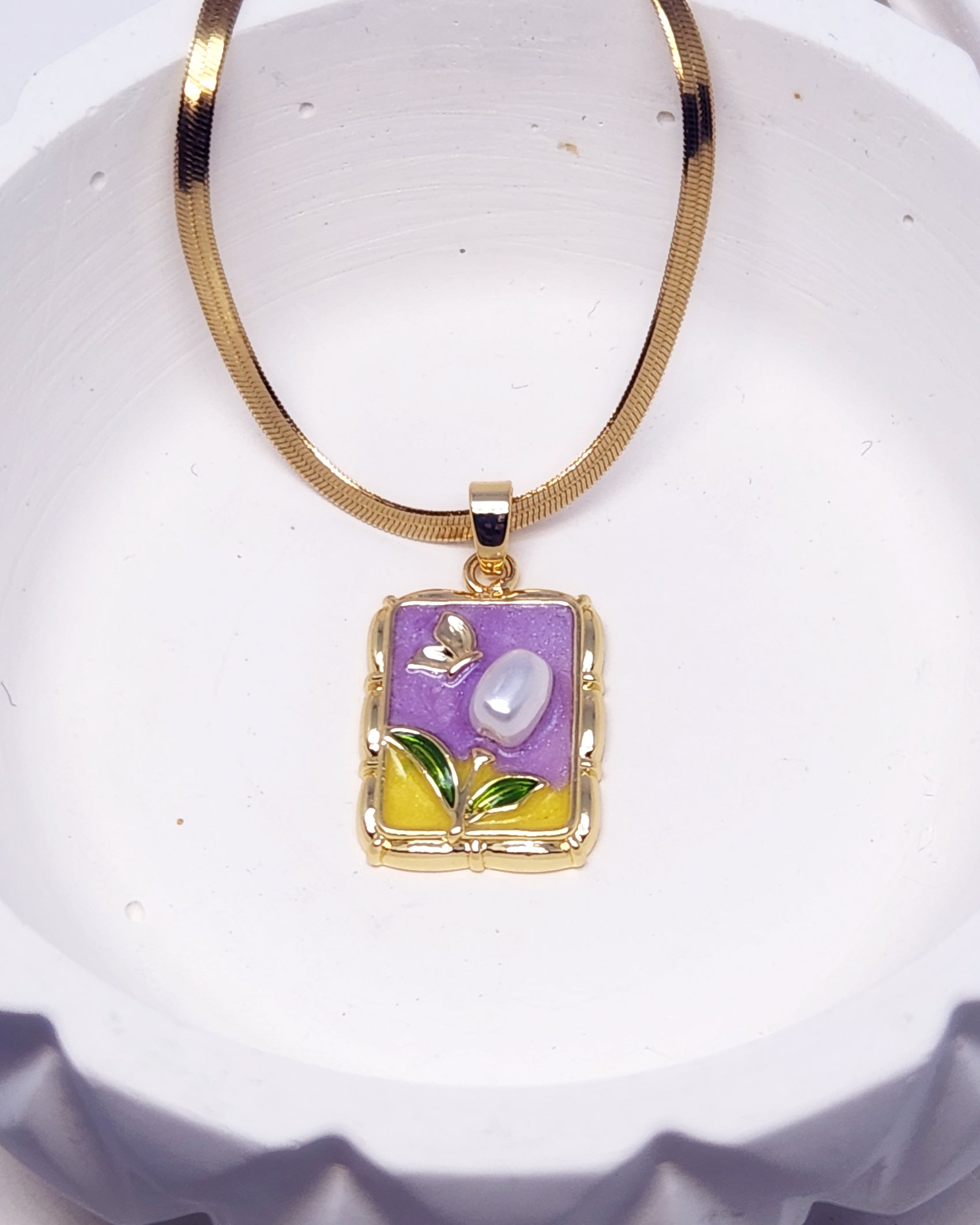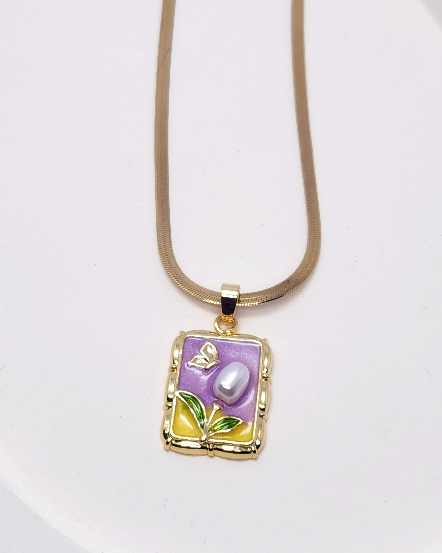 Encased in an ornate, gold-plated frame, a delicate garden scene unfolds in vibrant enamel. A single, luminous baroque pearl forms the heart of a delicate blossom, visited by a tiny golden butterfly—a fleeting moment of beauty, captured forever. This artistic pendant is elegantly contrasted by a sleek, modern snake chain.