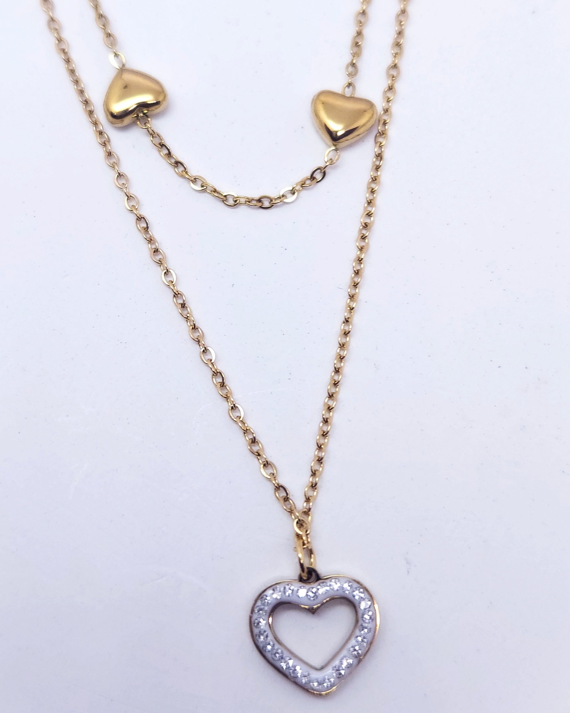 Get the perfectly curated layered look in one effortless piece. This beautifully designed necklace features two chains: a delicate upper chain adorned with floating, polished gold hearts, and a lower chain that showcases a single, brilliant heart pendant, shimmering with pavé-set crystals. Ingeniously connected to a single clasp, it offers a chic, tangle-free layered style. Crafted from durable, hypoallergenic stainless steel and plated in lustrous 18k gold, it's perfect for adding a touch of modern romance to any outfit.