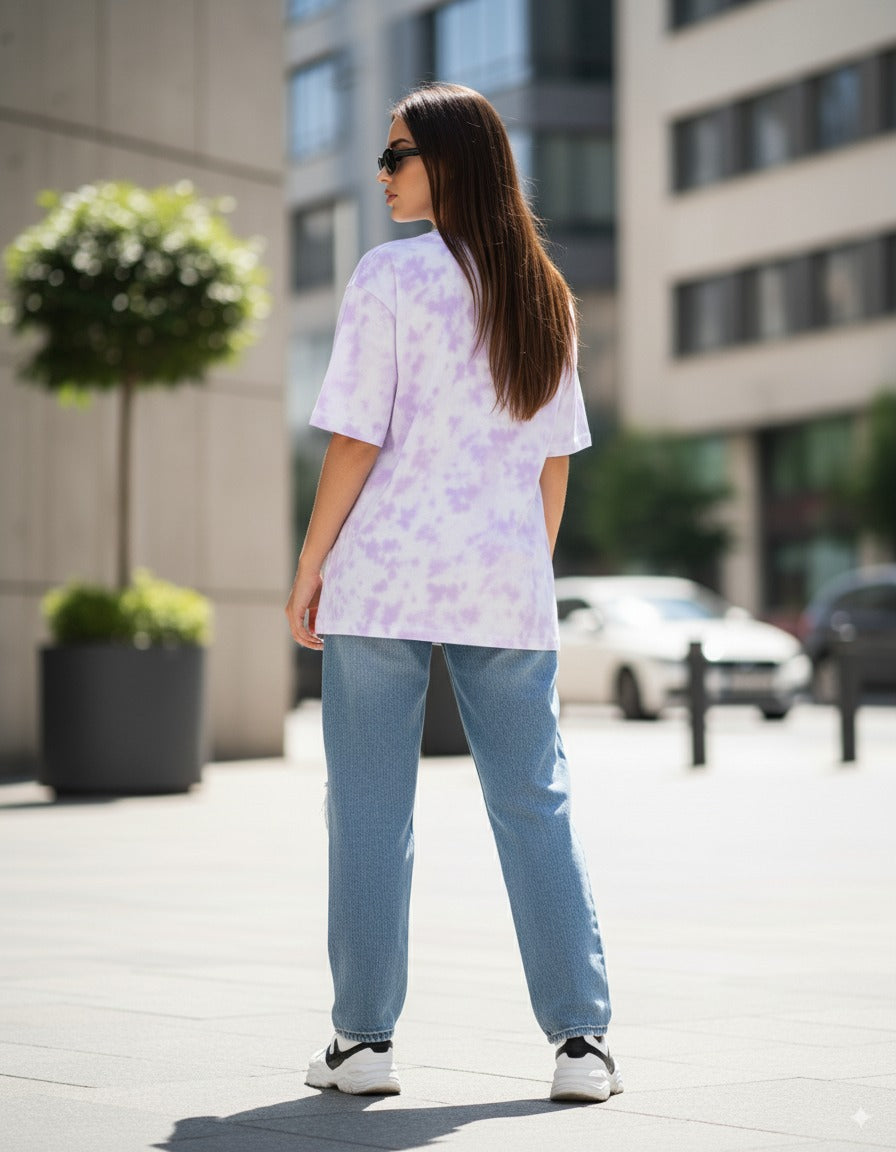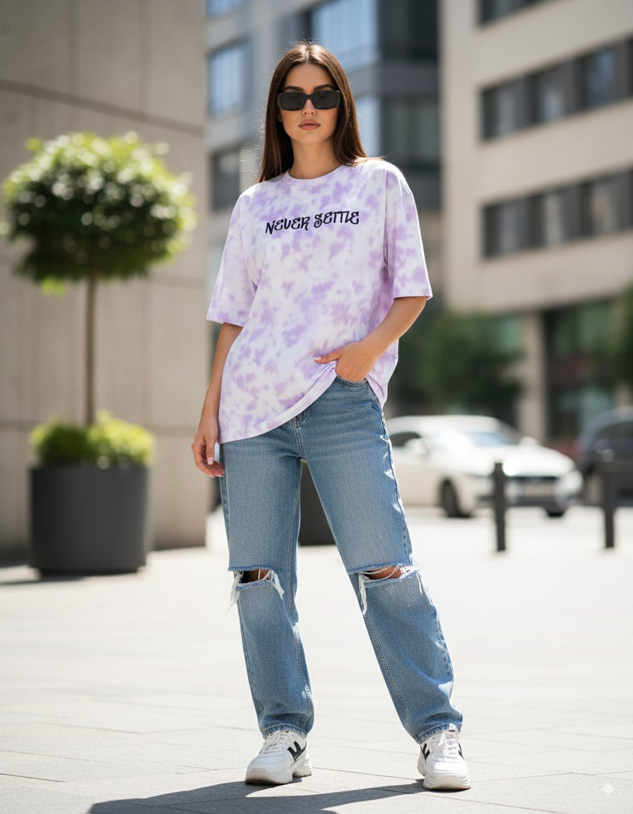 “Never Settle” Dreamscape Oversized Tee – White & Lavender Tie-Dye
