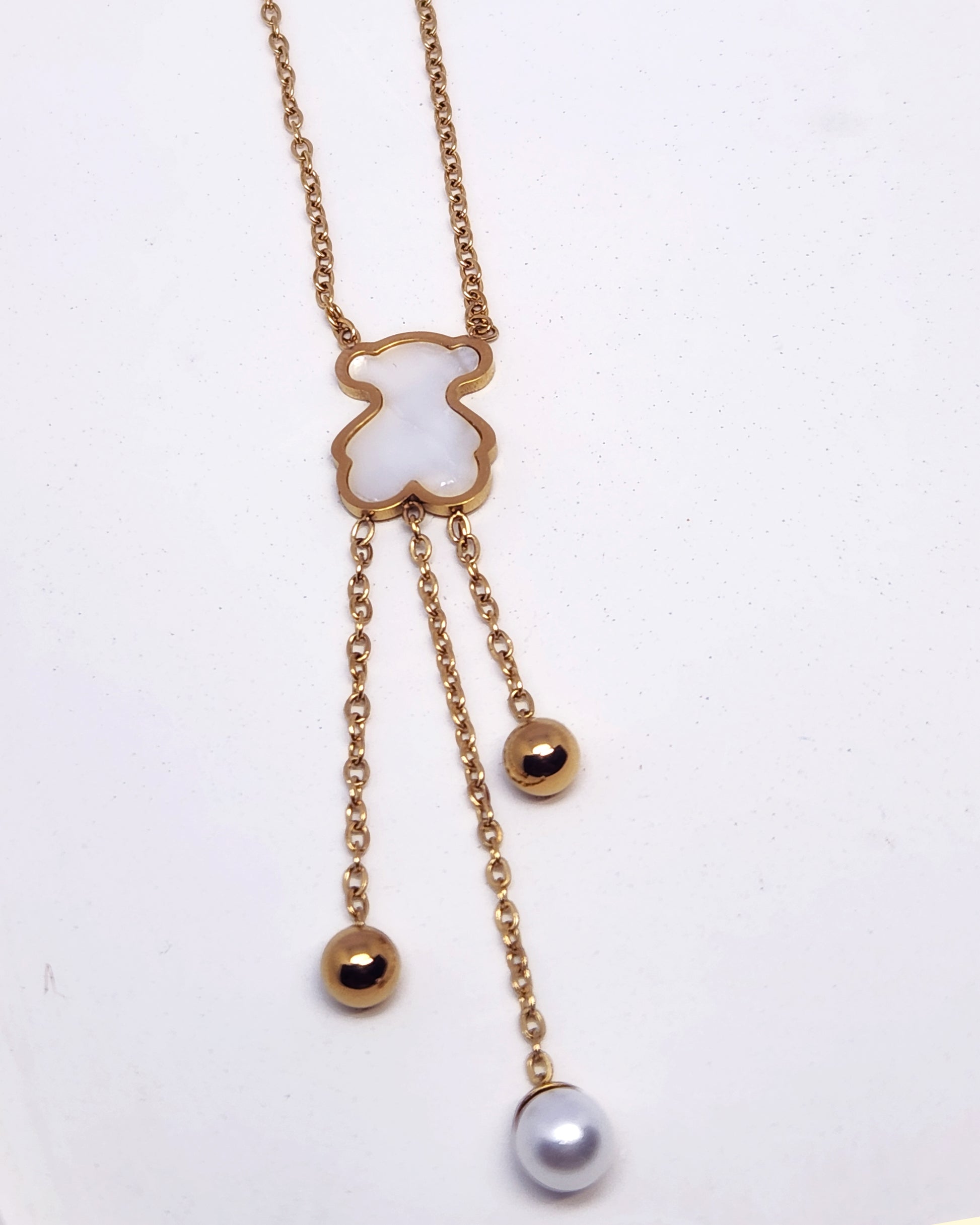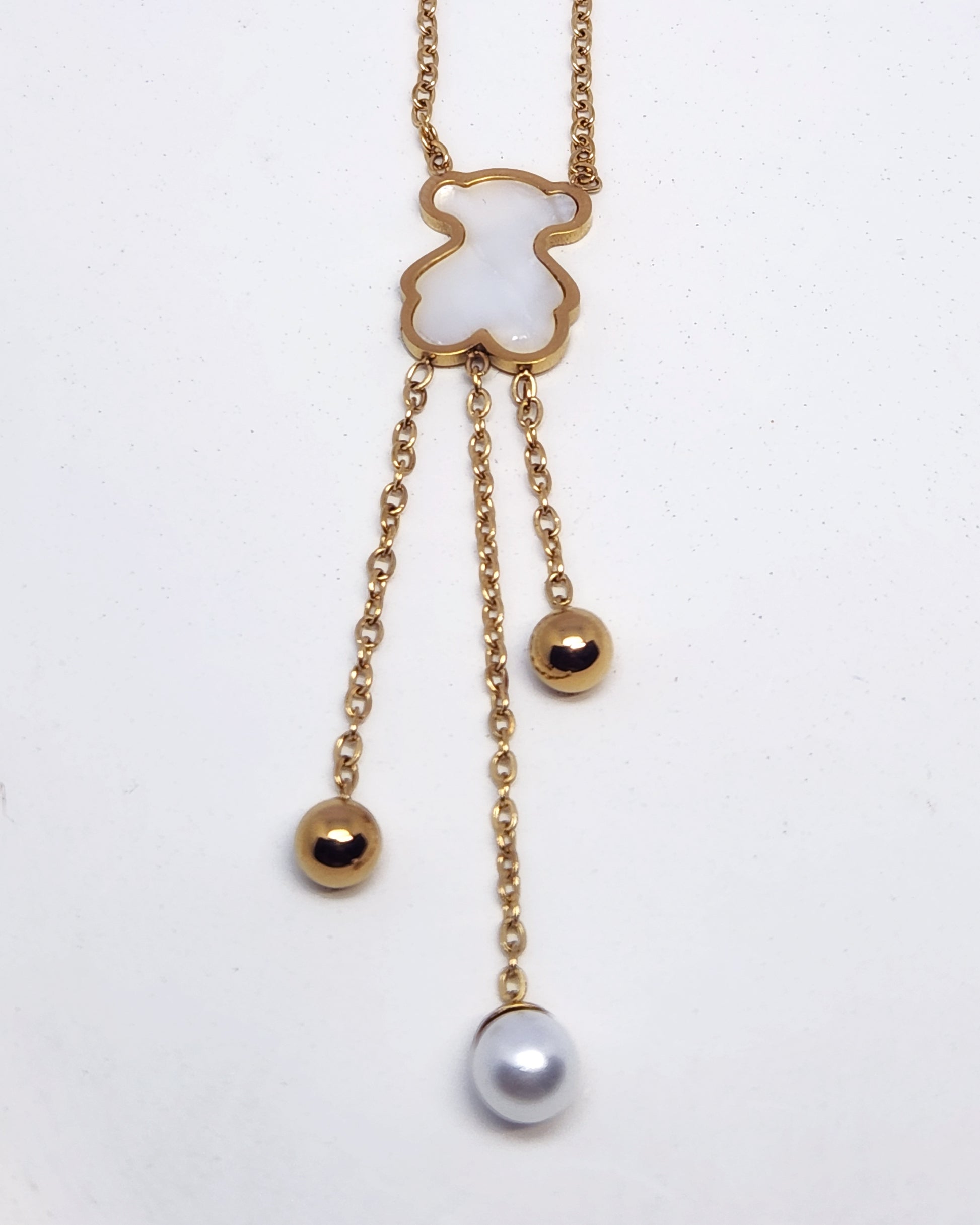 A fresh and modern take on the charm necklace. This stunning Y-style piece features a stylized bear motif filled with luminous Mother of Pearl as its central connector. An elegant cascade of chains drops below, artfully detailed with two polished gold orbs and one lustrous pearl drop for a perfectly asymmetrical finish. The sleek design is crafted entirely from hypoallergenic stainless steel with a luxe 18k gold plating, offering a graceful, kinetic statement that is both playful and profoundly chic.