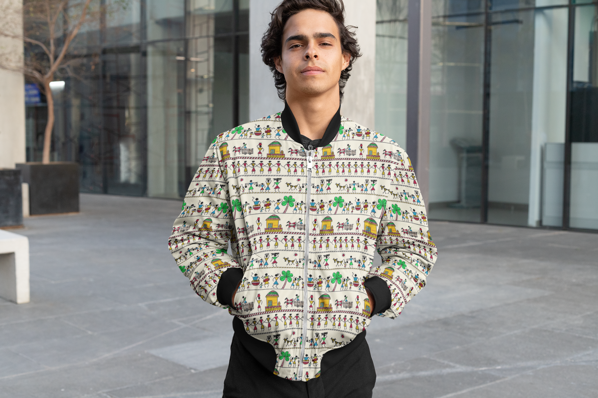Warli Wonders: Men's Artistic Pattern Bomber Jacket
